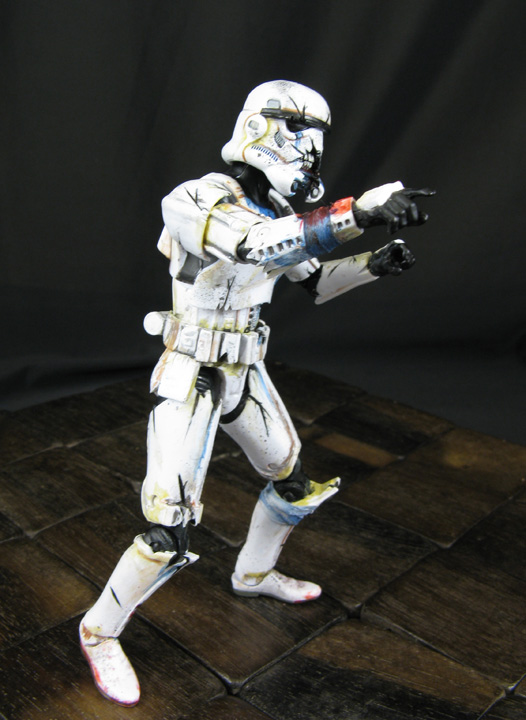 Here's another version of the Death Trooper taken from the concept art, this time with a non-removable helmet making it easier to replicate. I used a Judge Death lower mouth and hollowed out just the inside of the mask to affix the jaw. This leaves the original head joint intact. Various cuts, cracks, and zombie-damage effects were added along with a full detailed paint job and fabric bandage wraps. Watch out, this custom Death Trooper is shambling towards your collection!