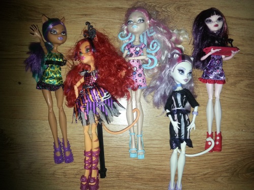 Some of the bluish ones could be Monsters High dolls. Yellow skirt might be snow white. Black dress doll is dark beauty maleficent.