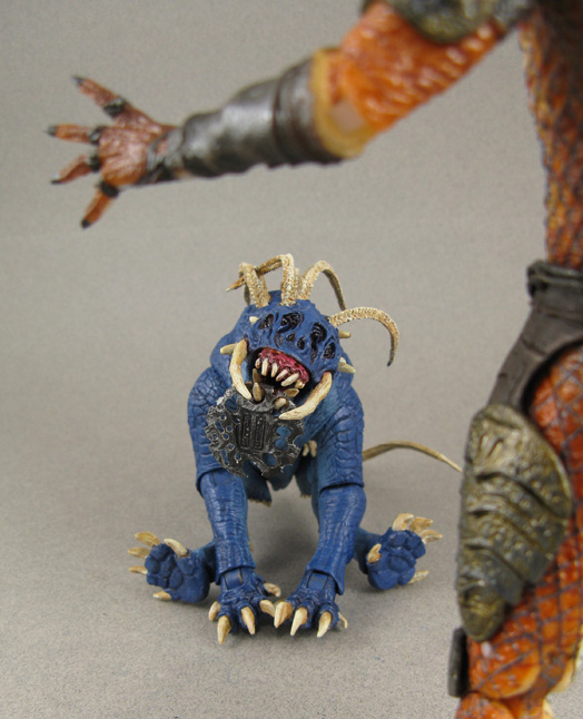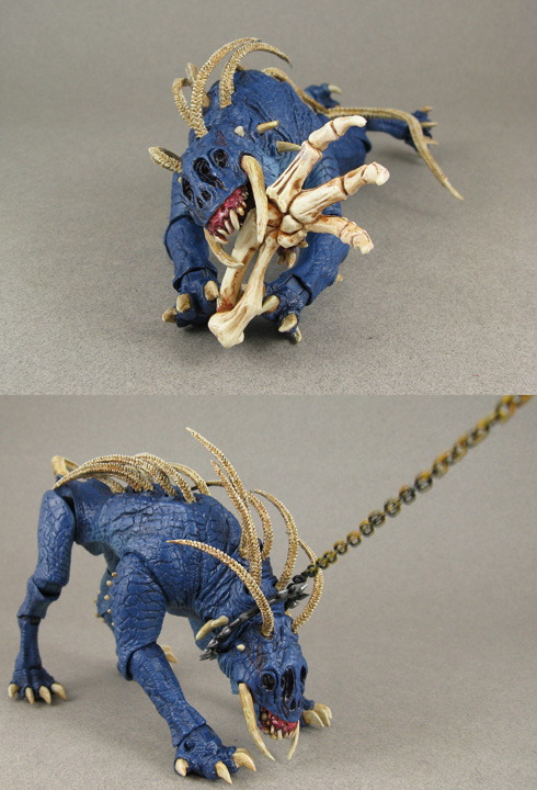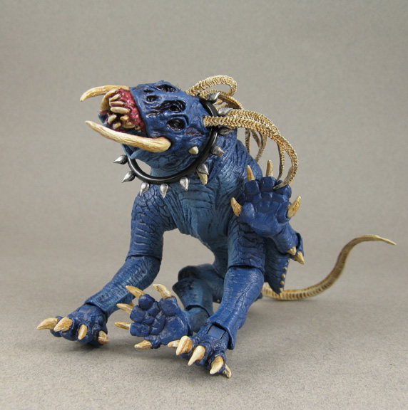 Those crazy looking Hounds the Tracker Predator used in the Predators movie were downright scary and it got me thinking, would there be different breeds on their homeword? Perhaps some used a pets? This custom Predators 'domesticated' hound was created from the regular NECA hound with the forward-facing spikes removed and Hybrid Predalien tendrils attached inside the ports. I added a longer tail and gave him a complete repaint with varying shades of blue for its skin color. Add in a heart-organ chew toy, collar/leash, monster bone to gnaw on, and chewed up Predator disc for a Frisbee, this Predator Hound was ready to get into some mischief!