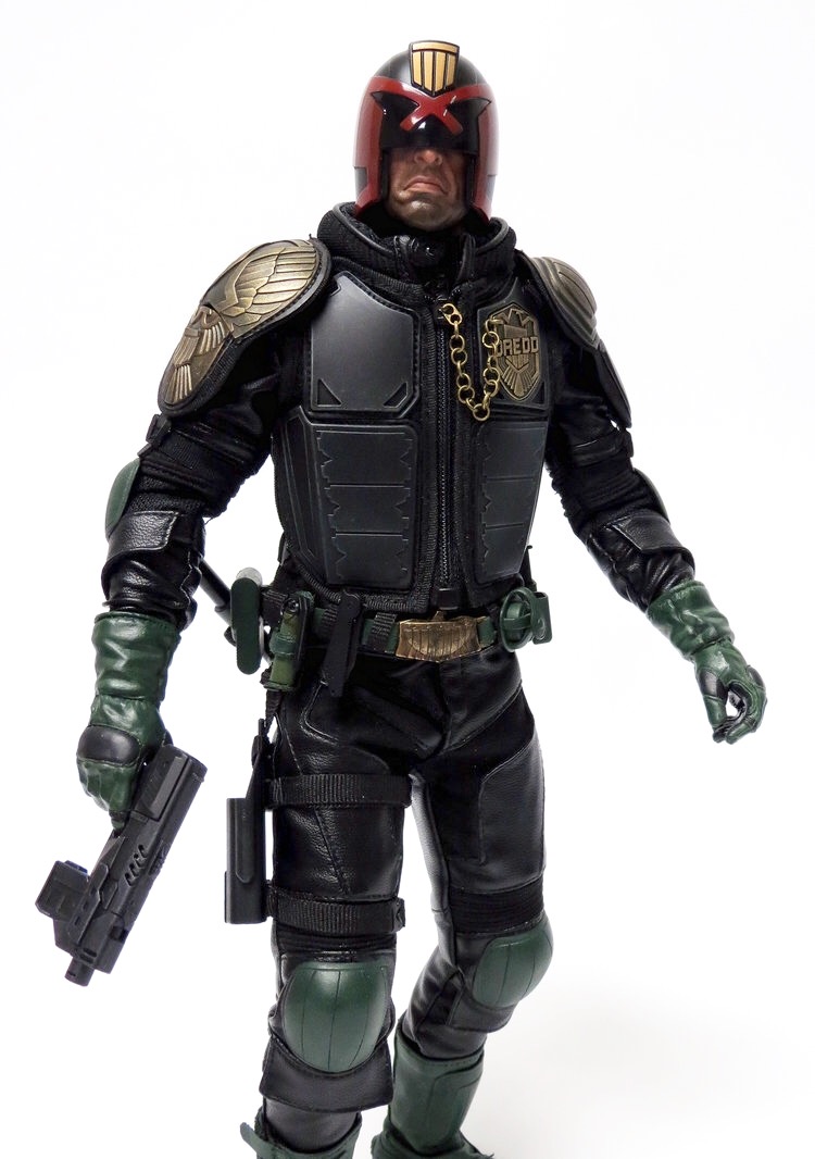 Here is my take on a custom movie 1/6 Judge Dredd. While I love the movie design I think he was missing the green which helps defines the character. So I repainted the figure and added new gloves and the chain to his badge... Although I did include one pic without the chain. |
