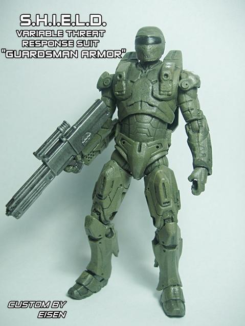what resulted was the "Guardsman" powered exo-suit, The armor only had the basic capabilities of the Iron Man armor. It could fly for short bursts, fire bulky wrist mounted downgraded repulsors, and had limited life support. It enabled the user to lift roughly 40 tons. several variations of it exist for specialized functions. notes: so here's m take on the famous Green Guardsman Armor. I used my spare PA armor iron man with ROC neo-viper head (forgot which version) gun from Agent Helix and hands from Major Bludd i think, decals are gundam decals. based it on the real life mock-up of the US infantry powered armor seen here: http://upload.wikimedia.org/wikipedi...ered_armor.jpg |