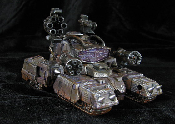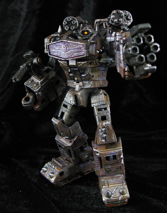 Shockwave joints the End of the Road post-apocalyptic Transformers theme with his cold and calculating demeanor inside an H-tank form for maximum destruction. Created from a deluxe Generations Warpath he has four C-clip weapons and a larger Gatling hand cannon that can be attached at different ports including his shoulders where there use to be static weapons. Shockwave's chest replaces the original turret and he has various hoses/spikes/battle damage added. A worn and weathered sponge detailing gives him the look of an aged battle machine with various bullet holes added to complete the look. Now Bumblebee has someone to fight!