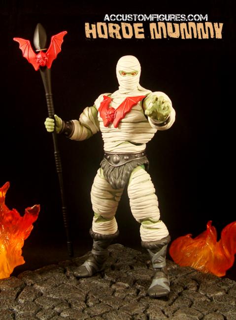 Horde Mummy was made from a Foe Men body with all the bandages sculpted, one Count Marzo hand, the head is completely sculpted over a Hyperion head, his chest symbol and staff are made from MOTUC fodder, and wrapped him up in a zombified paint job. Enjoy! AC |