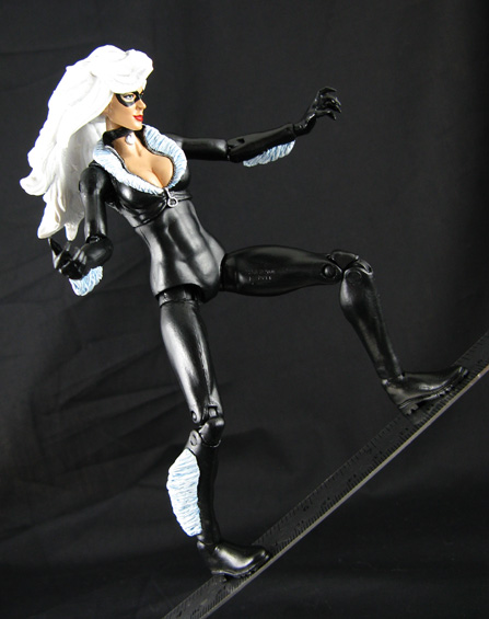 Prowling across the city rooftops comes the sleek and sexy cat burglar, the Black Cat! Spidey's love interest was made from a Black Widow/ML3 Mystique body, catwoman hands, Lady Death hair, and 2-pack Sharon Carter head. Her fur sections were sculpted from Aves Studio Apoxie Sculpt and magnets were added in her boots so she could climb up things just like her companion piece Spiderman can. Add in some stolen pearls and a wire claw-line to grapple buildings with and Black Cat is ready to take on the night!