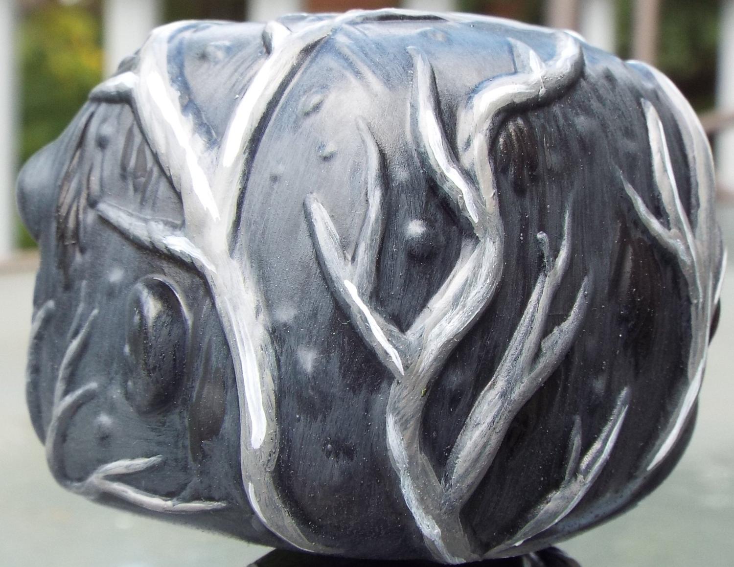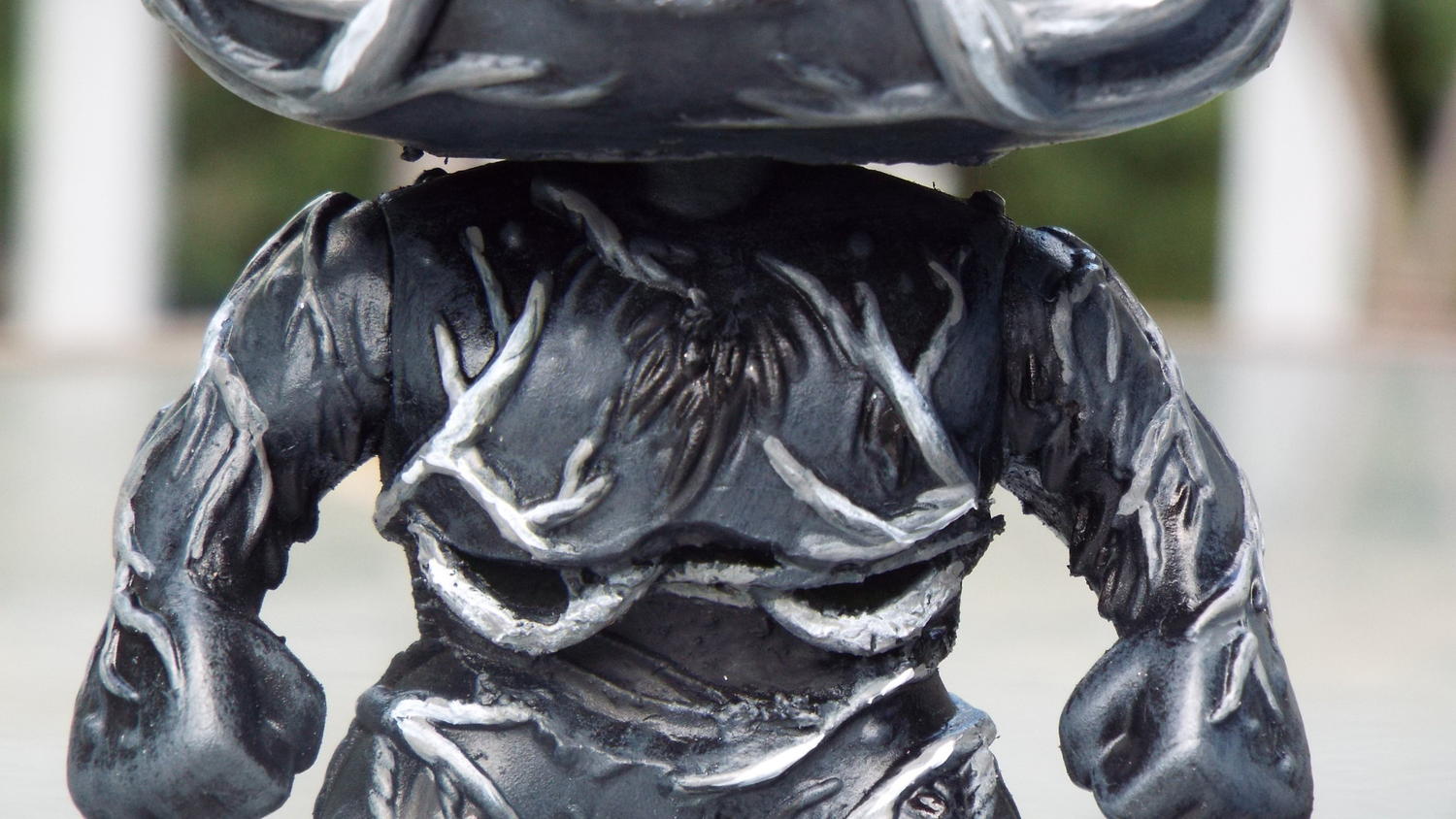 For this figure I used a Dremel to remove the eyes, reshape the eye sockets, and reshape the mid-section. I used some rib pieces from a dollar store skeleton Halloween decoration to try and give him a more skeletal look. For paint, I sprayed the entire figure with Krylon flat black. All of the other paint used was Folk Art acrylics. He received a dark grey heavy dry brushing for the next layer, two different shades of grey for the vines, minimal white for highlights to break up all that black and grey, and jet black for foliage "highlights".