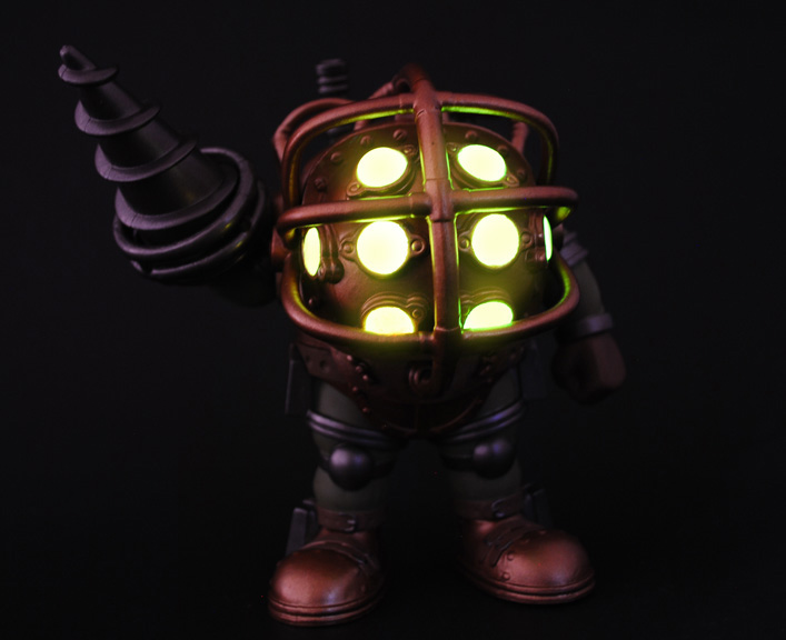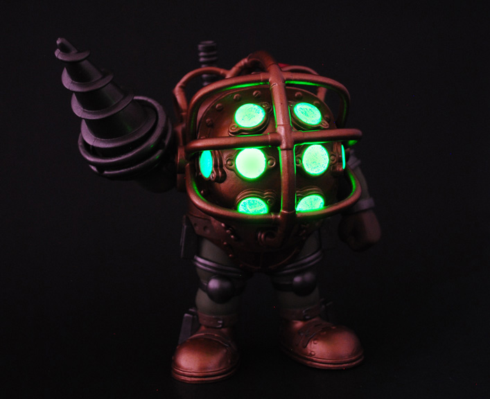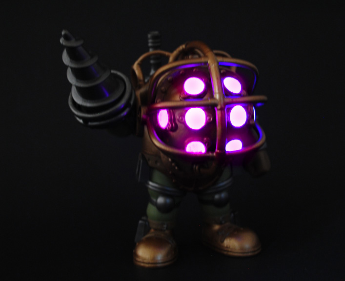 Not truly a custom but rather a mod, I took a Funko POP Big Daddy and gave it a light-up feature. You can do this too by using a hairdryer and heating up the helmet rack and prying it off, then prying the front helmet off the same way. Inside is hollow so I drilled out the eyes, used googly-eye caps for the porthole lenses, then filled them with clear epoxy. The led light kit came from one of the floating pool lights and turns seven different colors, but stays on whatever color you choose. This was perfect for Big Daddy's 'moods'.