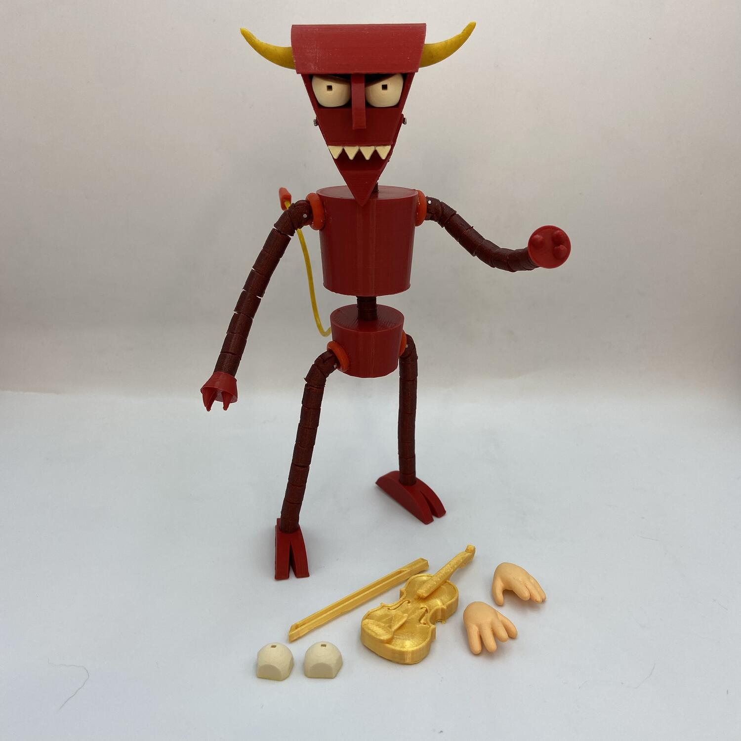 This is the robot devil from futurama. I know we got an official one years ago, but I wanted to try and make my own. It’s 3D printed with armature wire in the legs, arms, neck and spine. The jaw is hinged and he has a set of replacement hands (fry’s), 2 sets of eyes as well as his golden fiddle. It was a fun design challenge separating all the parts so I could print them in the appropriate colors. Hope you liked it, thanks for looking! :]