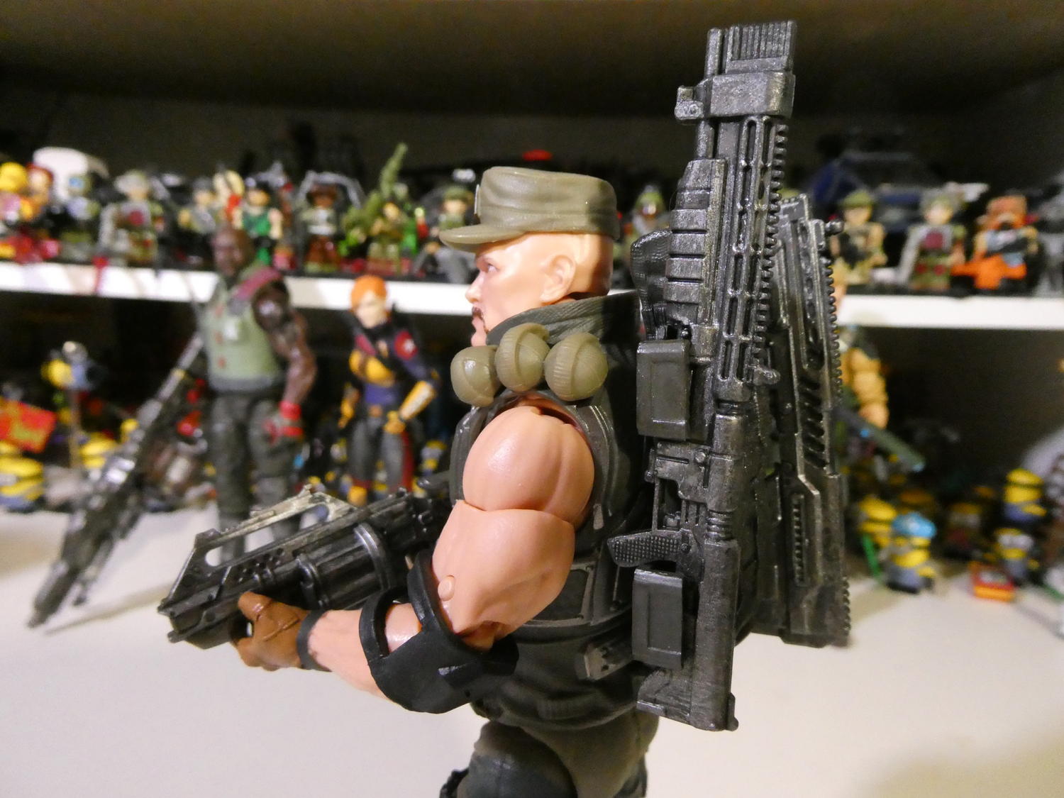 The sculpt is incredible despite the fact that he looks like someone who walked off the set of Duck Dynasty. The problem is with his accessories. First off, the hat just sits on his head, which royally sucks. They should have just molded the hat on the head or made it bigger. Any time you move him, the hat tumbles off. Hell, just look at him funny makes the hat tumble off. The same goes for the guns when it comes to attaching them on the backpack. I have no idea which side which gun is supposed to go on, but it doesn't matter as none of them stay put, especially the grenade launcher, which doesn't seem to go anywhere. I'm lucky if I can get them to sit in the slots on the sides for 45 seconds, but the worst is the one on the bottom of the pack as nothing can sit there at all. Not to mention Gung Ho can't even hold his guns properly, so he must be very strong in the arms to be able to shoot all of those guns one handed. While I was at it, I toned down the silver on him (right forearm, weapons and shin guards), and gave him a Gunnery Sergeant rank on his hat. Last edited by Cyclopswc; 09-29-2020 at 06:05 PM.. |