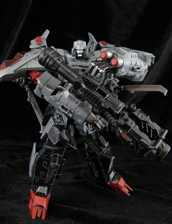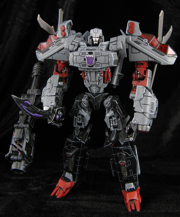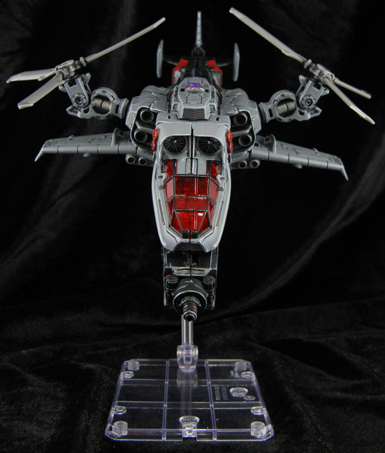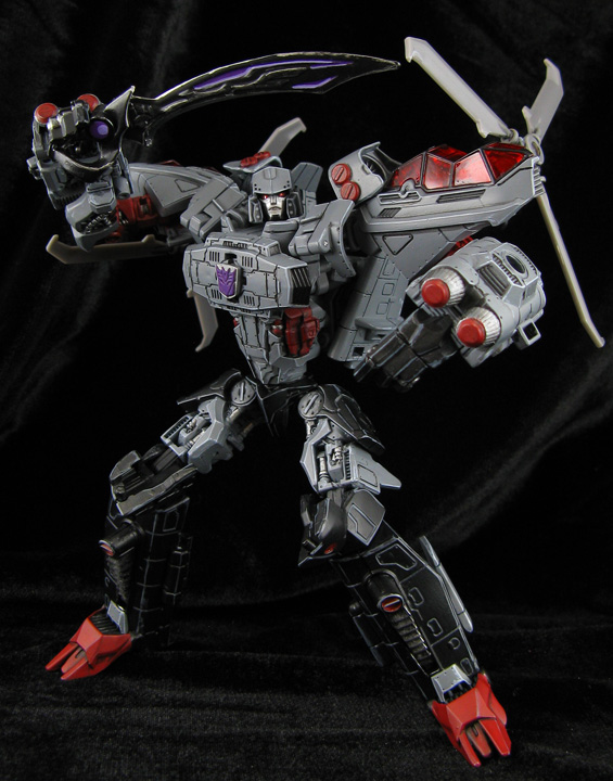 Here's a cross between a Generations look and the Animated Transformers look for Megatron using the twin-propeller helicoptor form. The head is from a 2-pack Deluxe tank-Megatron, body from DOTM Skyhammer, prop engine joints from a megablocks Halo figure, and rotors from two of those PCC Searchlights. I modded a DOTM Jolt mech-tech weapon to fit under the helicopter folded up and extend to full size for Megatron's cannon. The props unplug and fit behind his shoulders or the blade attach on his forearms in robot mode. I hard-edge-highlighted everything to add detail and gave him some shoulder plugs to simulate Animated Megatron's design even more. His chest rotor was removed and the inner post locked in place so the Decepticon symbol (Meantime chest) I added stayed vertical even when you turned the chest to transform. A figma stand makes a perfect flight base and Megatron is ready to take to the skies and rain fire down on some autobots.