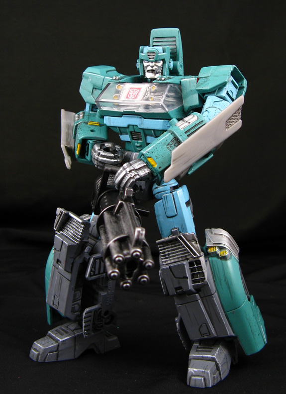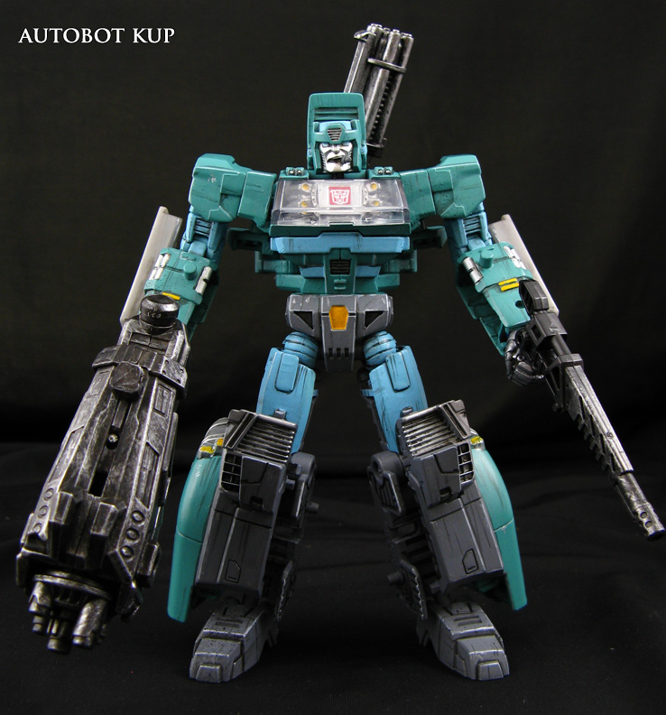 So the Autobots have a plan with a small chance of success and a high probability of casualties? Then it's time to call in the Wreckers! Here's another member of this elite fighting crew, my custom Kup done in a 'Wreckers Reformatted' style using the new 30th Thrilling Transformers body types. He was created from the Orion Pax mold, a pickup of sorts that was perfect for Kup's body type and an iGear Kup head. He was then given some heavy weaponry for decimating Decepticons and has a battle-worn paint job that proves he's been through many a cycle.
