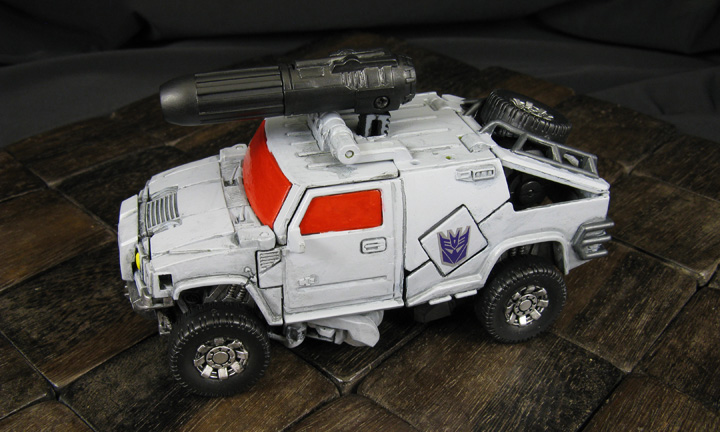 The leader of the Decepticons gains wheels once again, this time as a military Humvee! Here I've created a custom Generations Megatron in a deluxe scale using a type II movie Ratchet mold, FoC Optimus Prime feet, Evasion Prime hands, and a Titanium Megatron head along with various fodder parts. The vehicle sides are now attached to the shoulders instead of the waist and fold up behind him. I also modified Ratchet's arm cannon gears to accept Megatron's new Fusion Cannon. One weathered, beaten paint job later and Megatron is ready to fight.