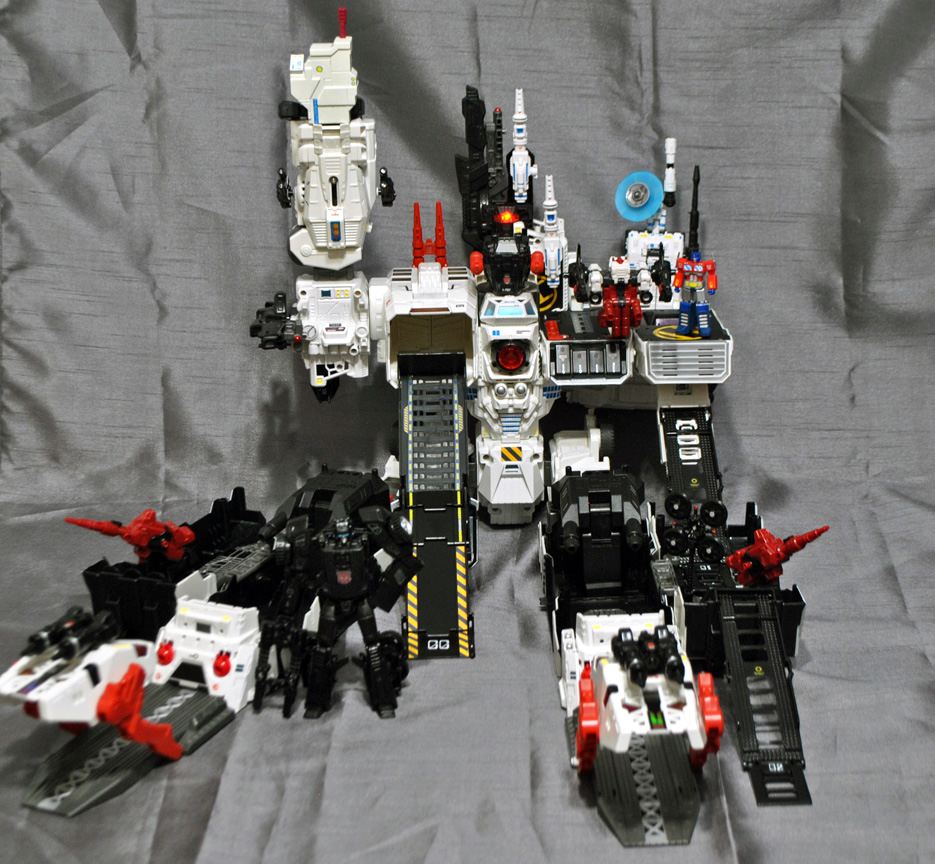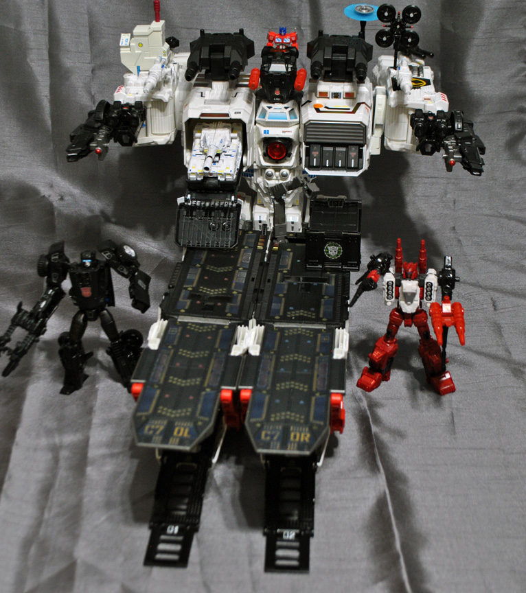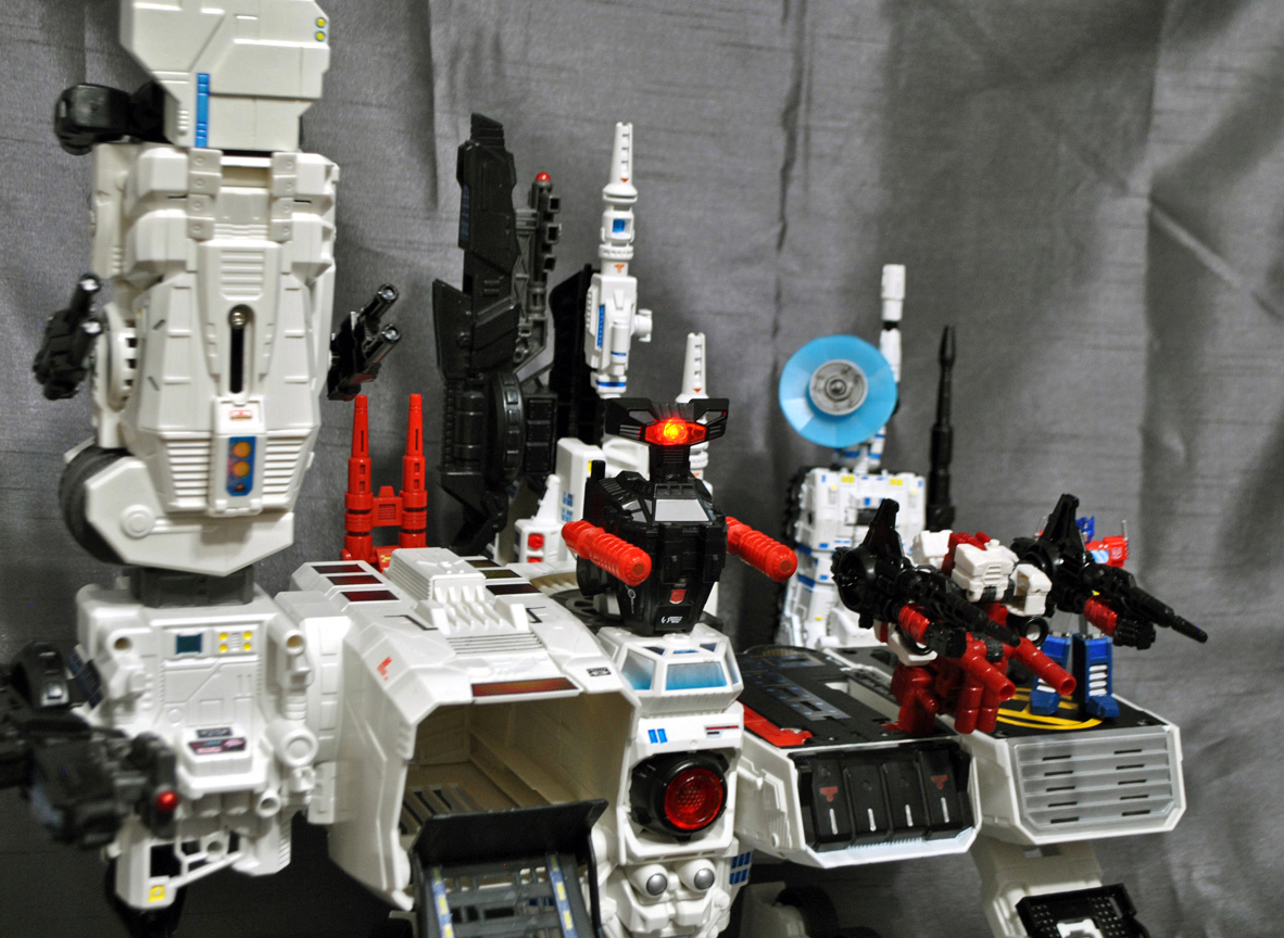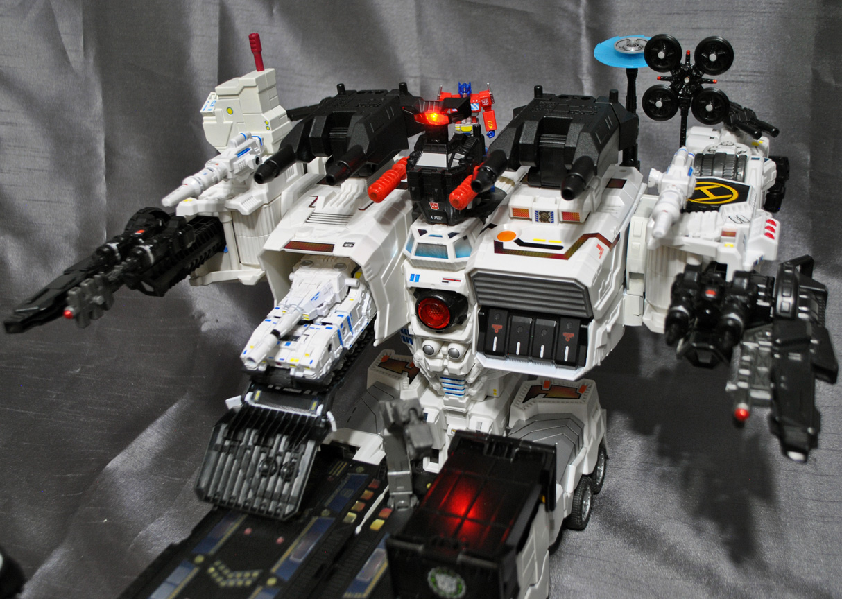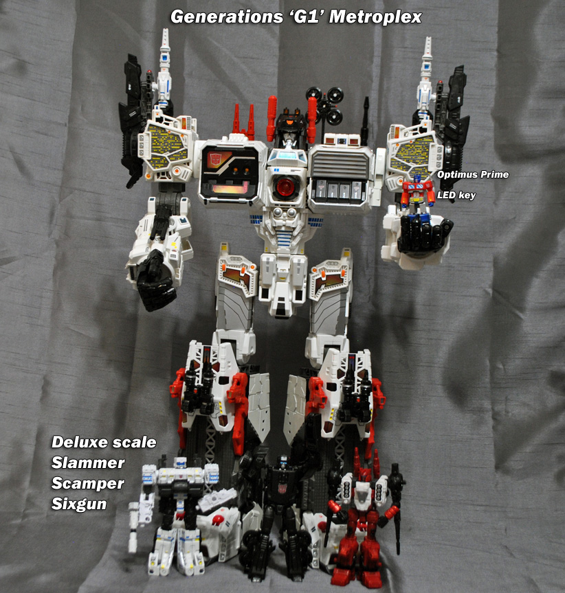 This is the largest custom I've done so far, introducing a Generations 'G1' style Metroplex that comes with a new DELUXE SCALE Scamper, Sixgun, and Slammer! This is a huge figure and comes with multiple new attachments such as shoulder antenna, G1 red double barrel gun, twin knee turrets, 3rd party heel turrets, twin arm turrets, antenna, satellite dish, spire, 3 extra ramps, (one folding chest c-tainer ramp, two leg ramps) and of course his three bots. Metroplex transforms into a city mode and battle-carrier mode. City mode features a clip-on chest ramp that folds down and extends further and a clip on tower building-top to hide his hand. You can put the shoulder antenna, double guns, and other cannons just about anwyhere and there are two new 5mm ports located on his back for added placement. The small Optimus Prime is actually a magnetic 'key' that activates the eye and target lights! These magnetron LED units function separatly from the electronic light and sound which still work when you press his chest. Touch Prime to the top of Metro's head and the eyes turn on, touch again and they turn off!