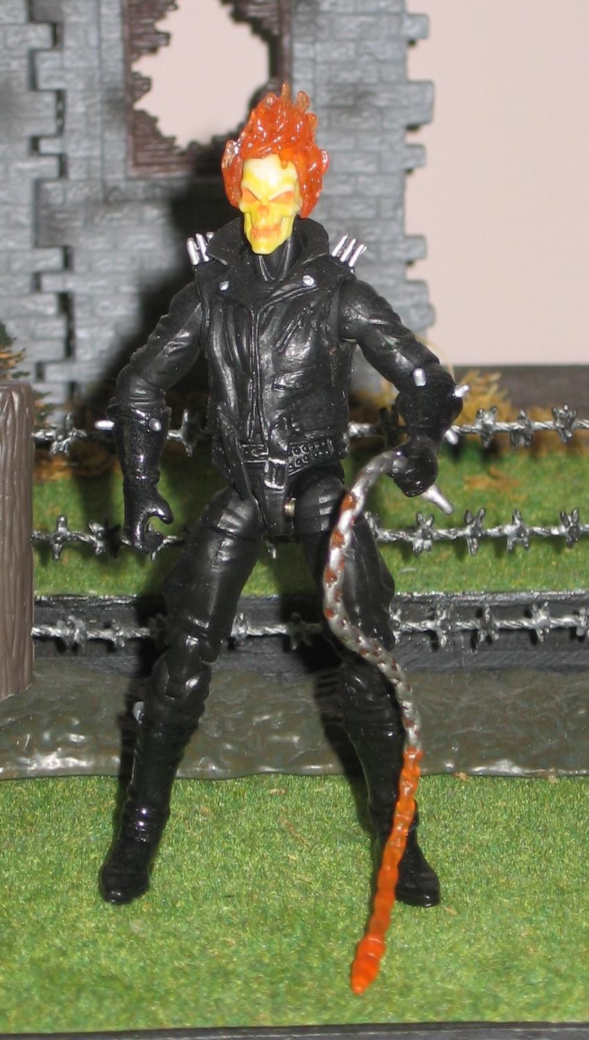 Mixed some parts and this is what I came up with. This one's up on e-bay. I also include my first attempt at Damion Hellstorm: Son of Satan. I want to change the head, legs and pitch fork. Any suggestions? Hope you enjoy and thanx for looking! Modern Ghost Rider Head, Legs, Chain = MU Ghost Rider Torso = ROC Snake Eyes Upper Arms = 25th Breaker Lower Arms = 25th Cobra Commander Jacket = Indiana Jones Mutt ![]() ![]() ![]() Hellstorm Head = 25th Breaker Torso, Arms = MU Namor Legs = Cobra Commander ![]() Latest: