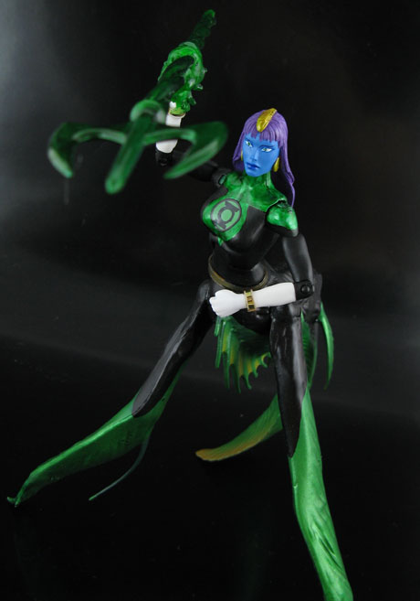 Mermaid Green Lantern? Yes, Mermaid Green Lantern. Introducing Lunessa Koinua swimming your way from the watery planet of Aeros. Fitting because she was made from the body of the Naut Kei Loi Movie Masters, fins swapped and turned upside down with some modifications to the body. The upper female half is made from a Katma Tui with a custom Zatanna cast head from Camco Kid castings which you can find in my Links page. A trident construct was created for her and Lunessa was ready to swim with the intergalactic fishes, see!
