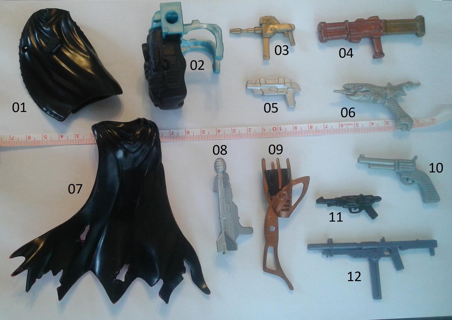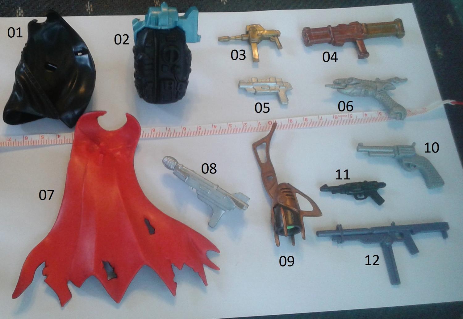 Identified so far... 01. 02. Galoob Biker Mice From Mars 1994 Freedom Fighters 25580 25587 Rad Rebel Vinnie 03. 04. 05. 06. Men In Black Mikey with Exploding Body 07. 08. 09. Star Wars Geonosian sonic cannon from Sun Fac or Geonosian Warrior 10. 11. 12. 13. Zeo Laser Pistol from Power Rangers Zeo. The Auto Morphers I believe. 14. Galoob Men In Black Flame-Blastin' Jay 15. 16. 17. Kenner Real Ghostbusters Screaming Heroes Peter Venkman https://images-na.ssl-images-amazon....AC_SL1335_.jpg (NOT Broken Star Wars Power of the Force Chewbacca 1995) 18. 19. GI JOE Monkeywrench harpoon gun *broken* 20. 21. 22. Transformers G2 Skyscorchers Afterburner 23. GI JOE Venom vs Valor Cobra BAT II v3.2 24. Kenner Robocop and the Ultra Police Wheels Wilson 25. 26. 27. G.I. Joe Pathfinder 1990 28. 1980's Playmobil Indian peace pipe Last edited by toymeistr; 12-04-2020 at 08:18 PM.. Reason: Items identified. |