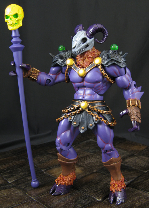 Skeletor's go-to weapon of choice has usually been his Havoc Staff, an ancient artifact with an unknown origin...until now. This custom Masters of the Universe Classics figure was made for that purpose creating the character 'Lord Havoc' from the realm of Despondos. He was made using a Skeletor body/havoc staff top, Scae-glow alternate head, Soul Reaver Raziel hands, 4Horseman Scarabus feet/fur, and ML Ghost Rider armor parts. You can swap the skull staff head to the figure and add the included hood for a brand new version of Skeletor giving two figures in one.