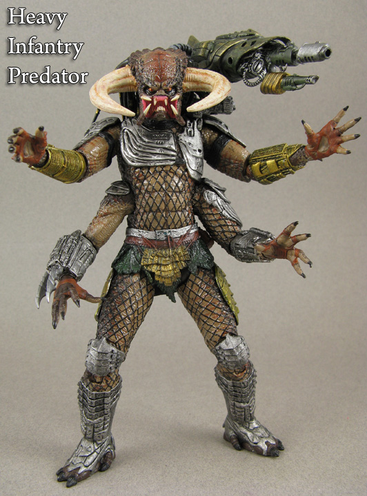 No you're not looking at the next Mortal Kombat boss, this is the Heavy Infantry Predator based on an old, outproduced prototype that Kenner did. The character in question had four arms and a giant plasma caster on its back along with massive horns coming from it's head (Google Heavy Infantry predator if you're still skeptical). Here I wanted to replicate that design and used NECA Predators figures to do so, installing a second set of arms on the torso, constructing armor and the giant plasma caster from fodder parts. The partial-helmet was created from a hollowed out from a Predators Tracker and outfitted with horns. A smaller plasma caster is mounted on his upper right forearm and a combination of old/new Predator feet were used. As odd as this design is I wanted to pay homage to Kenner, an amazing company at the time that helped shape my childhood with it's awesome offerings!