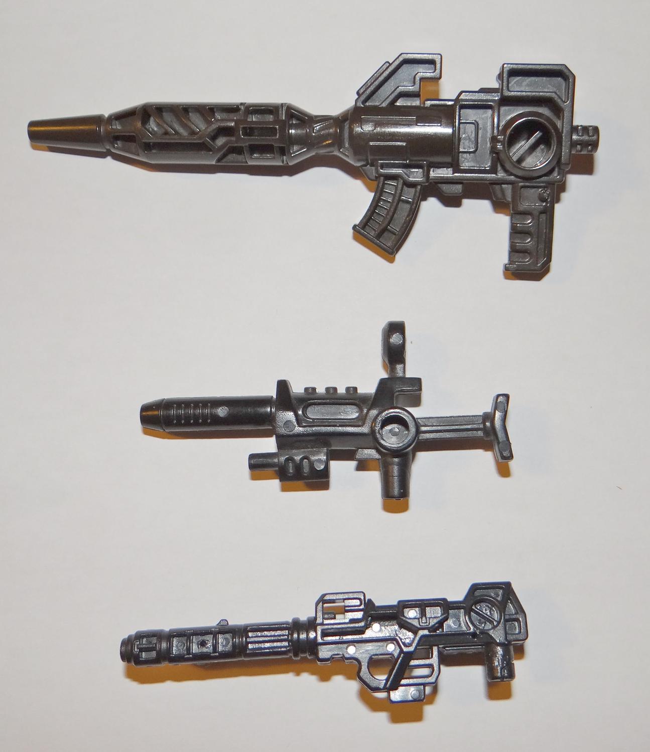 I'm pretty sure these are vintage G1 or G2 Transformers accessories but I checked with online sites like Transfomerland and I can't find these three guns anywhere. The dark brown gun at the top of the photo is a little over 4" long, the other two guns are black and they are all a mystery! Thanks again guys, Jeff |