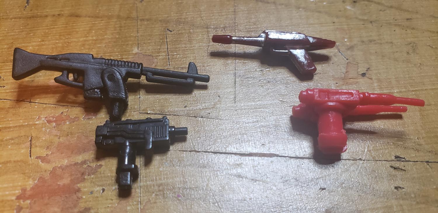 I have a silver gun, what i think is a red gun but in 2 pieces...and two black guns i am unsure what collection or set they are with. I have star wars, motu, transformers as well as gi joes and a ton of superheroes! Not sure where any of these go!?!? Please help.