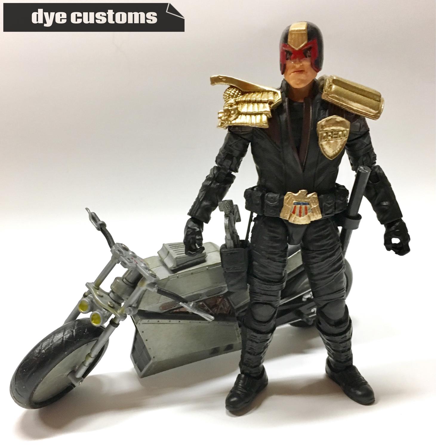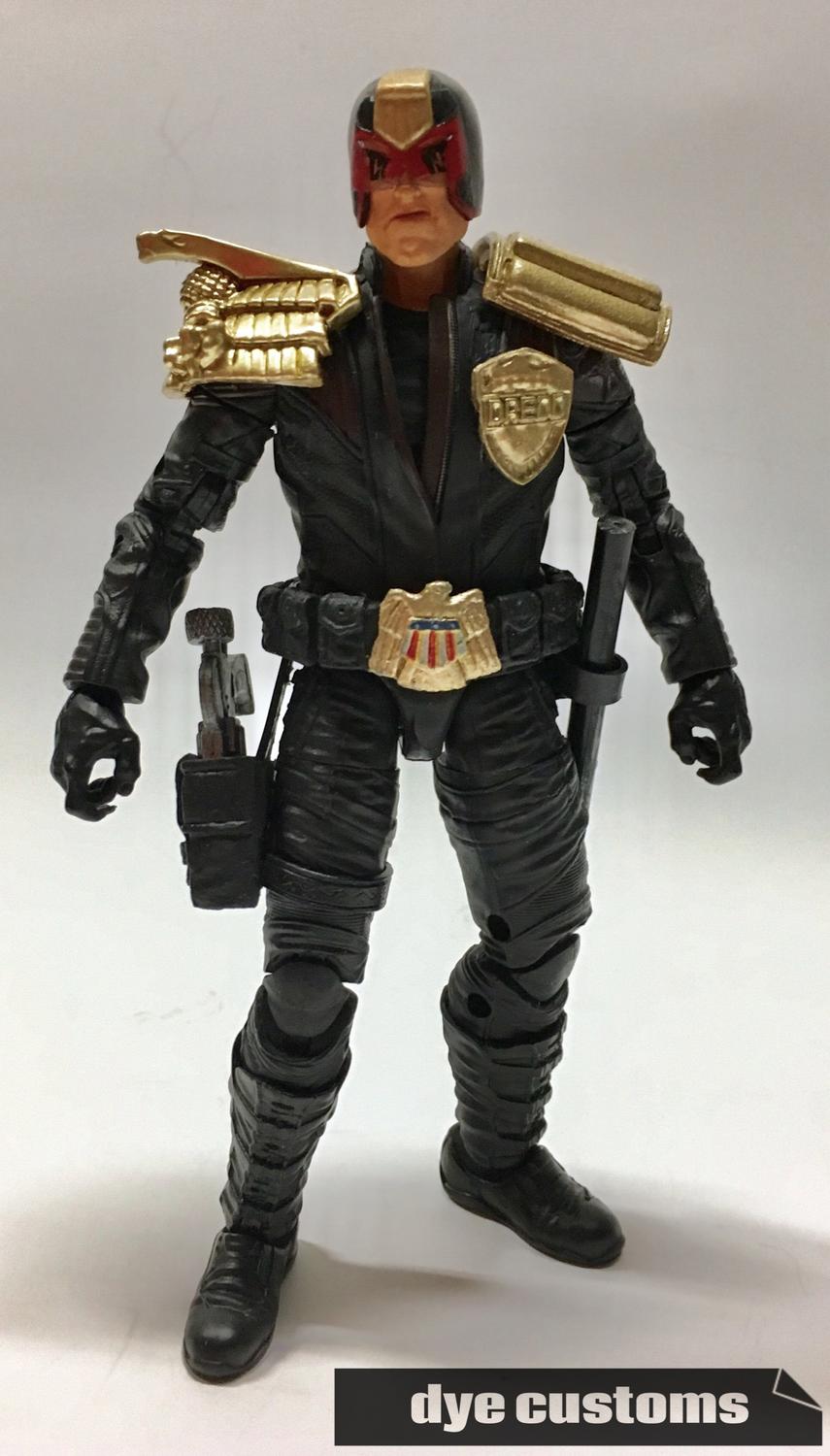 So for this custom I wanted to make Dredd into a full time motorcycle style judge based in the 1960's biker style. Body is a Marvel Legends Star-Lord, modified, painted/dyed. The head, most of the gear and the gun come from a Toybiz Dredd. Badge is from a ReAction Dredd. All parts modified to fit and painted/dyed to match. |