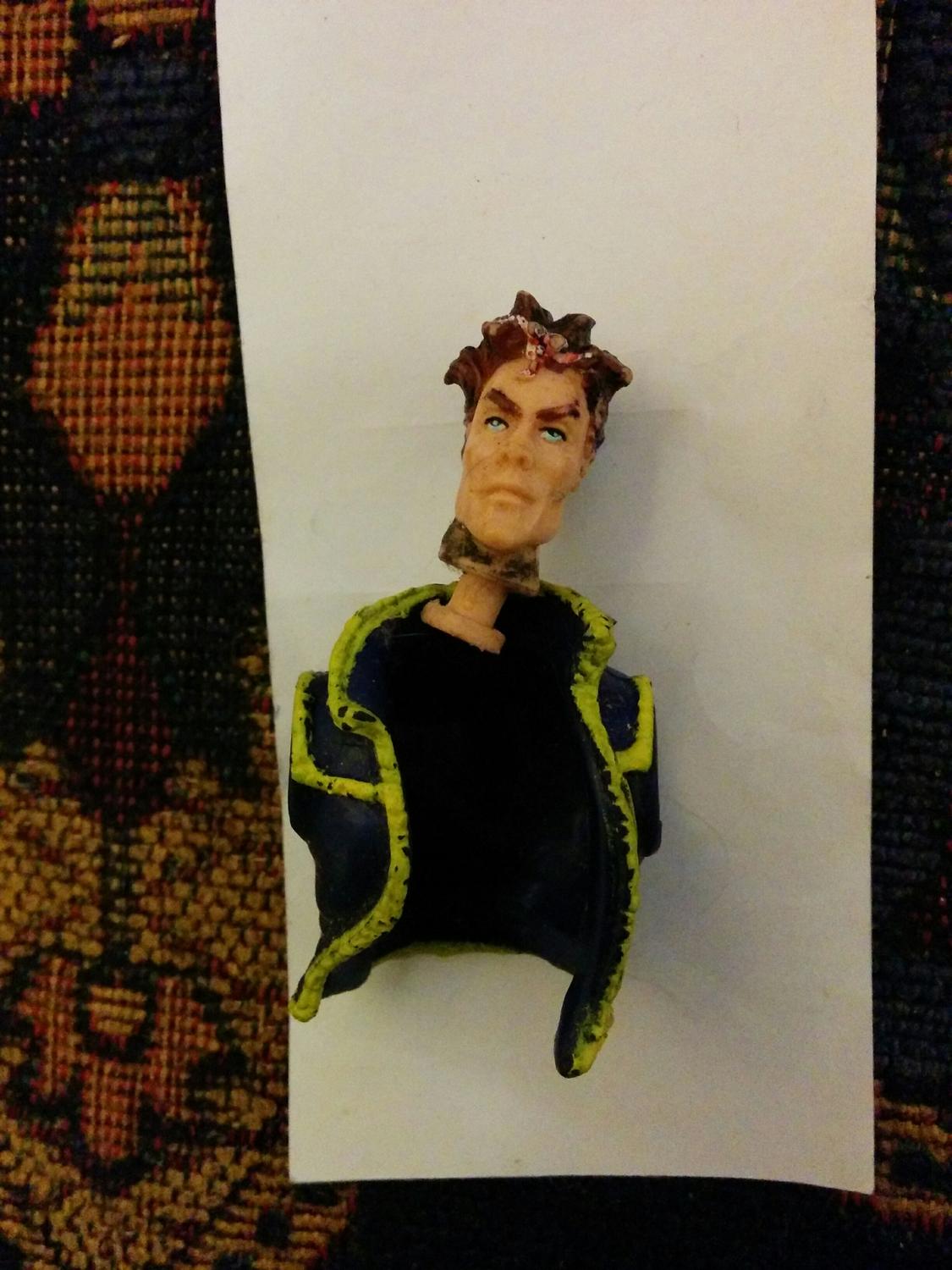 This was an xmen toy I bought as a kid and I can't remember what xmen he is. He came with fire things you attached to his body like a flame stand. His costume was all blue.
