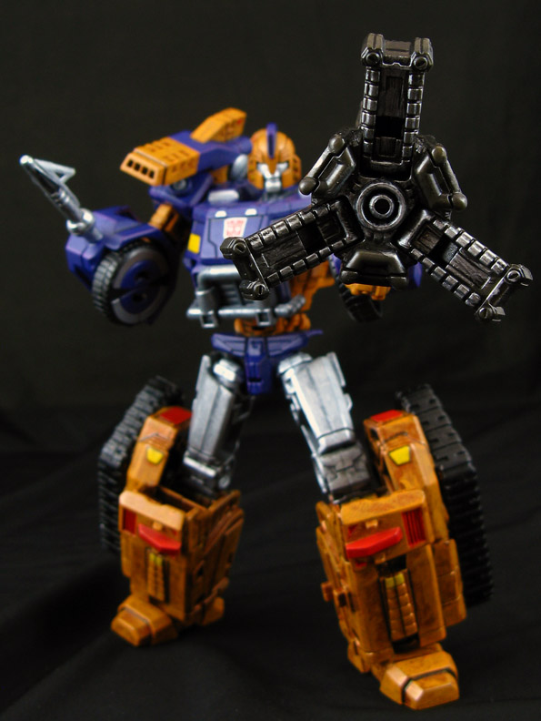 The Wreckers are an elite team of Autobots that are called in when there is a small chance of success and a high chance of casualties. Leading the team is the mighty Impactor, a legend in the field. We have a Fall of Cybertron Wreckers team but they're based off the FoC Bruticus molds, not a perfect choice for the characters really. Here I'm 'reformatting' the Wreckers with all new bodies starting with Impactor! He was created from the FoC Optimus body with the original Impactor head, Veritech shoulder cannon, treads/kneepads/harpoon/grille from various fodder figures/vehicles. I wrapped him up using a weathered metallic orange and purple paint job and modded Roadbuster's gun. Keep an eye out for the rest of the reformatted Wreckers team!