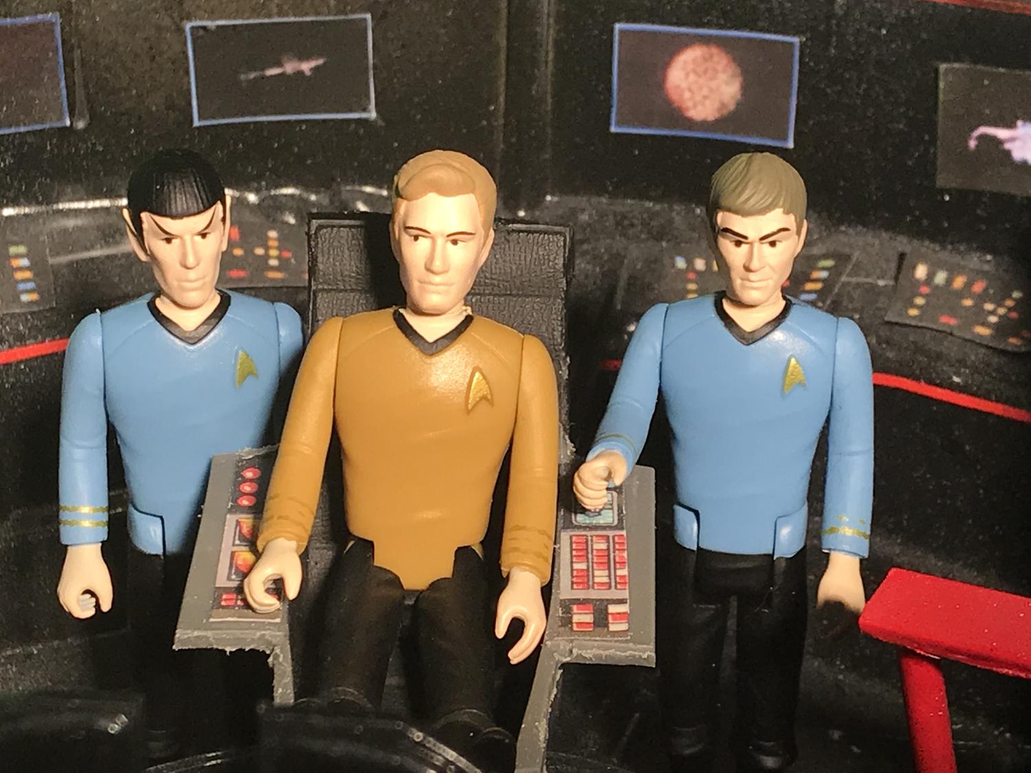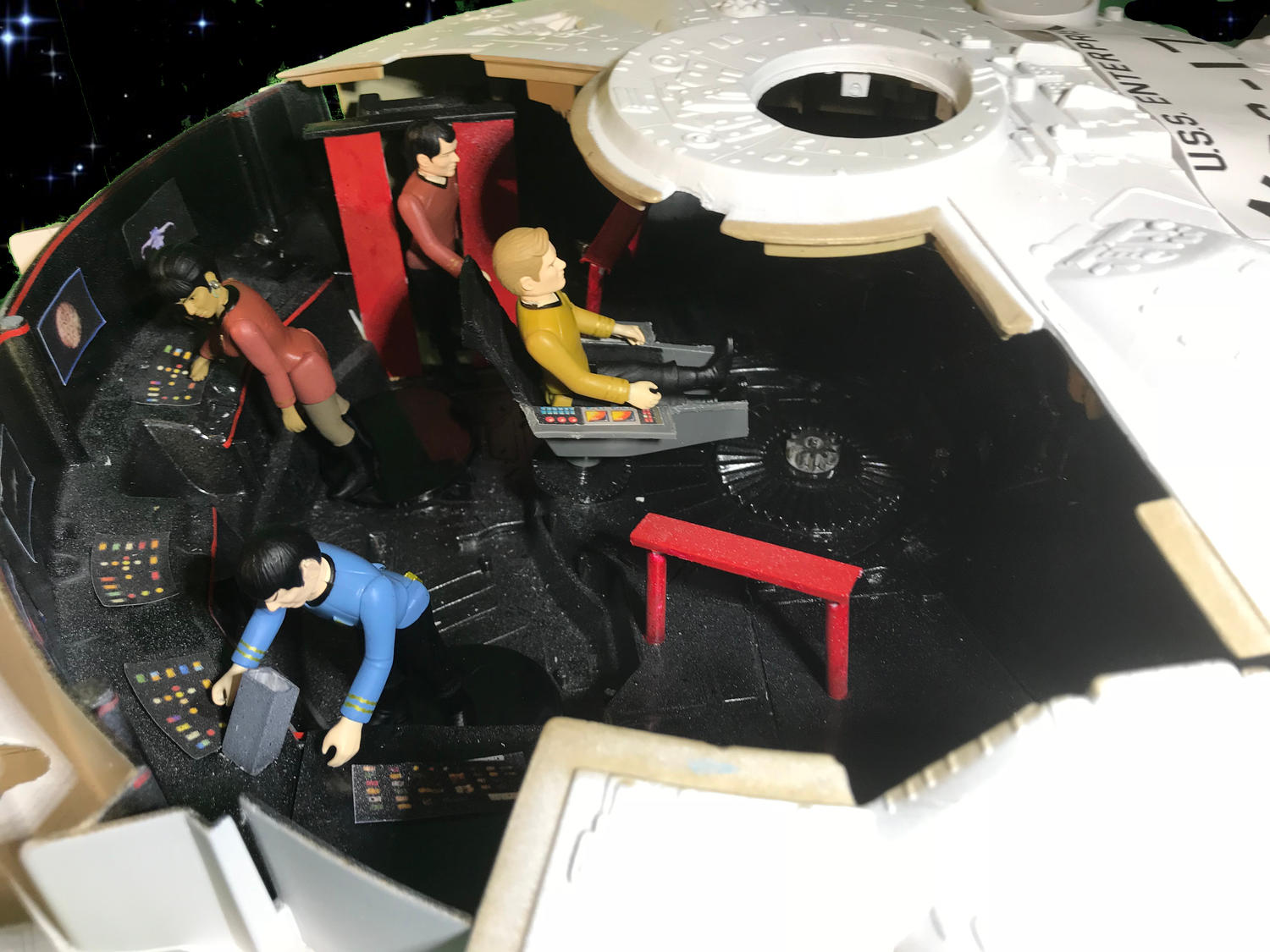 I've been over at TFW 2005 for a few years and have mostly done Transformer/Star Trek crossover customs. Christmas before last, one of my students, knowing I'm a Trekkie, gave me the Scotty Reaction figure as a gift. A couple of months later, I stumbled on the Retroblasting channel on You Tube, who had a video bemoaning the dearth of Trek playsets in 3 & 3/4" scale back in the 80s. The wheels started turning in my head and wouldn't stop until a year ago when I started looking for junker Kenner Star Wars vehicles on Ebay. My goal was to make an Enterprise vehicle/playset as it might have been made back in the late 70s/early 80s. In other words, not going for photo realistic detail but something true to the original Kenner aesthetic. Just in case anybody wants to take a crack at this or is just curious, the parts are as follows: Saucer Section: A heavily stripped and cut down Millennium Falcon. Captain's Chair comes from a Y-Wing. (I would put more detail here, but apparently my phrasing sets off some kind of filter.) Engineering Hull: Rebel Transport with the side cut out. Bow and stern panels were already missing, so I replaced them with two halves of a plastic bowl from Dollar Tree. Sick Bay has a divider wall and the Bio Bed is made from the Falcon's gunner chair. Engineering has the control panels from the transport. A Y-Wing thruster adds the center unit. Transporter pads made of figure stands make up the rest of the interior. The shuttle bay at the stern contains a shuttle made from a combination of an MLC Mini Rig with some Landspeeder engines. Nacelles: Y-Wing engines with plastic pipe extensions. They are connected to the hull by the forks I cut off the Falcon. Whew. Oh, yeah: Along the way, I had to pick up the rest of the Reaction Trek figures. And then I decided to customize figures for Chekov, Arex, M'Benga, and an Andorian and Tellarite red shirt. (Bonus points if you knew any of them past Chekov.) Anyway, I hope you enjoy. The first few photos are of some vintage-style box art I mocked up. Look me up on TFW 2005 if you want to check out my other works, but I figured this would fit better here. |
