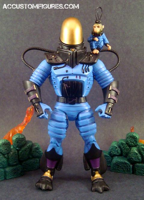 Kill-Rilla and Space Monkey are two of Dark Eternia’s most feared out-laws. A product of scientific testing, Kill-Rilla escaped from one of the moons of Dark Eternia with his battle suit and fellow test subject, Space Monkey. Despite his size Space Monkey is twice as angry and twice as ruthless as his larger counterpart. Together they travel Dark Eternia taking out bounty hunter and hero alike. Kill-Rilla is a Flogg base with a DCU Fishbowl Lantern neck piece, and a McFarlane figure head. Space Monkey was from a DC Braniac figure with sculpted space suit. Finished both off with a propper MOTUC paint job. Enjoy! AC |