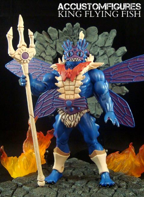 King Flying Fish is the ruler of the Etherian Seas. With the help of Hordak, King Flying Fish has the ability to fly, swim, or walk between dimensions. He is amassing an aquatic Evil Horde of his own to overthrow Mer-Man and Kill-Eel, the rulers of the Eternian and Dark Eternian Seas. Armed with his Bone scepter and enchanted sea sword, King Flying Fish is ready to bloody the waters!