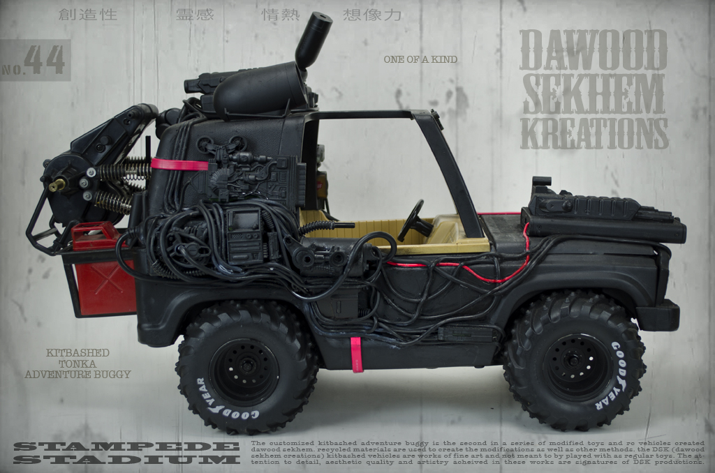 I found two of these trucks on craigslist and purchased them immediately. This is the first one that I've kitbashed (modified). The base is Tonka's Adventure Buggy released back in the 70's. It has a metal body which Tonka trucks are known for. I used to play with these when I was little and now look, I still do. I kitbashed this truck with recycled materials and then painted it. You can see more of my work on my facbook page at "Dawood Sekhem Kreations'. Thanks for viewing! |