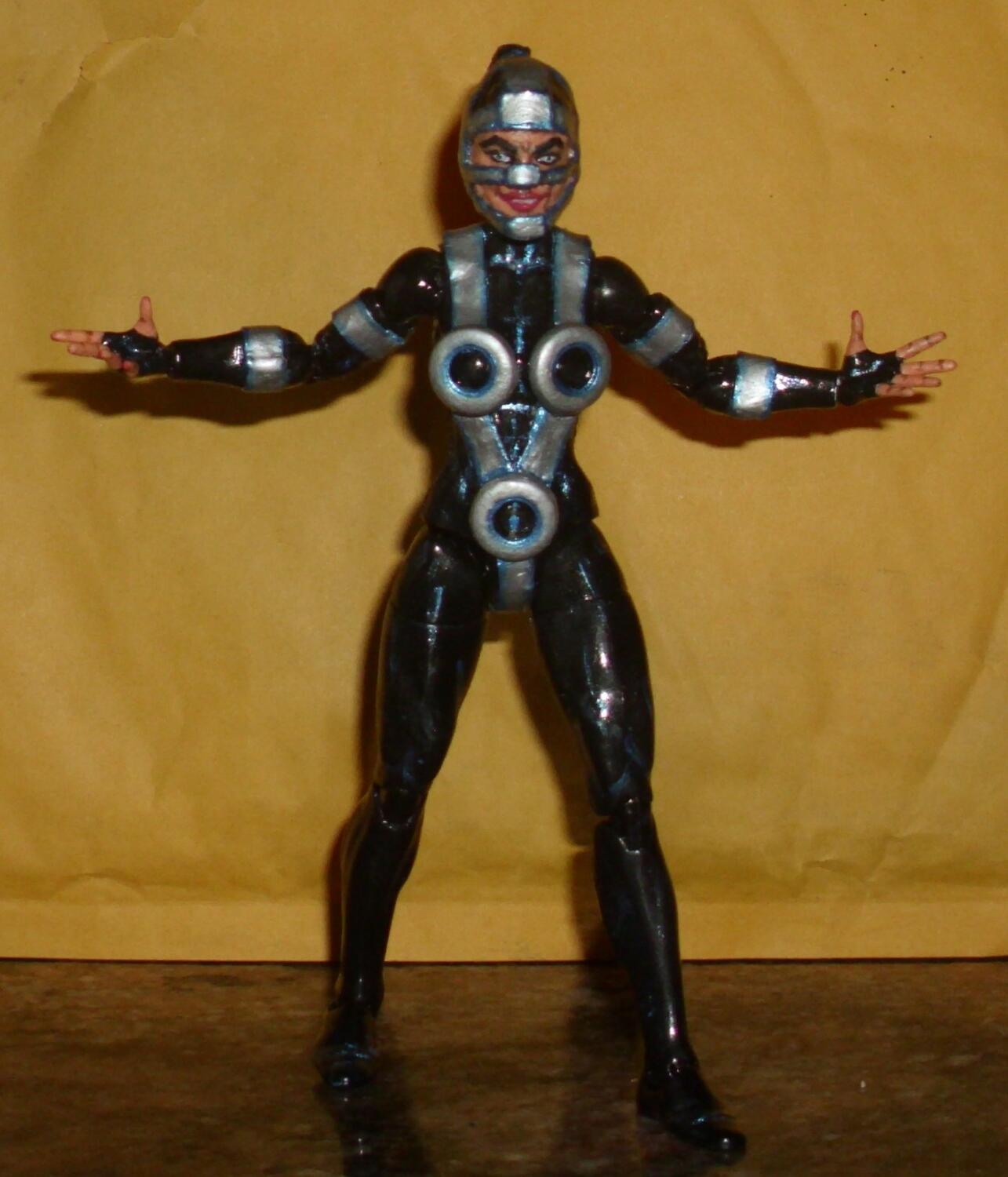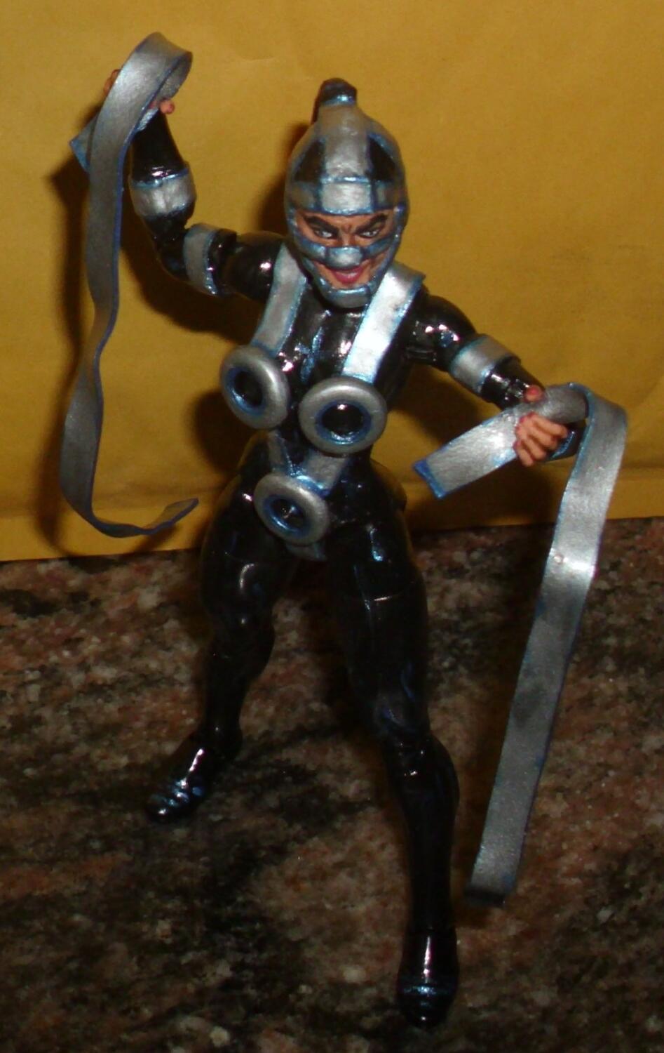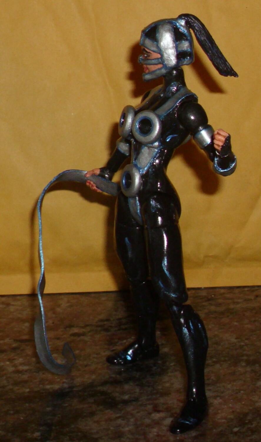 Lashina of The Female Furies is made from Marvel Legends Shriek. After yanking off her hair, I sliced off the rectangular peg beneath it on her scalp as well as her earrings & belt. The bracelet just slid off. I had to build up her skull a bit.
