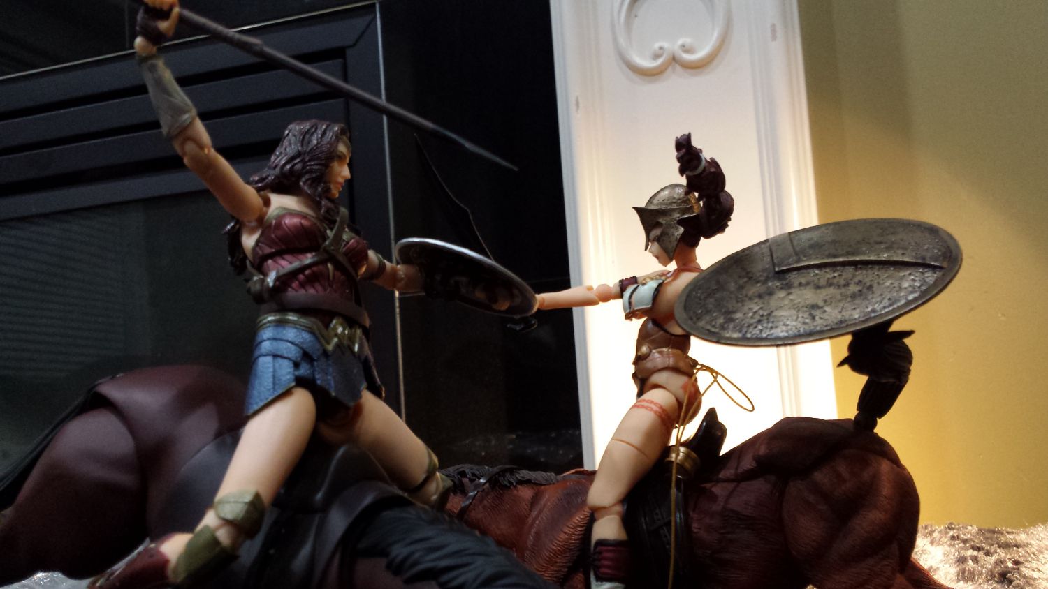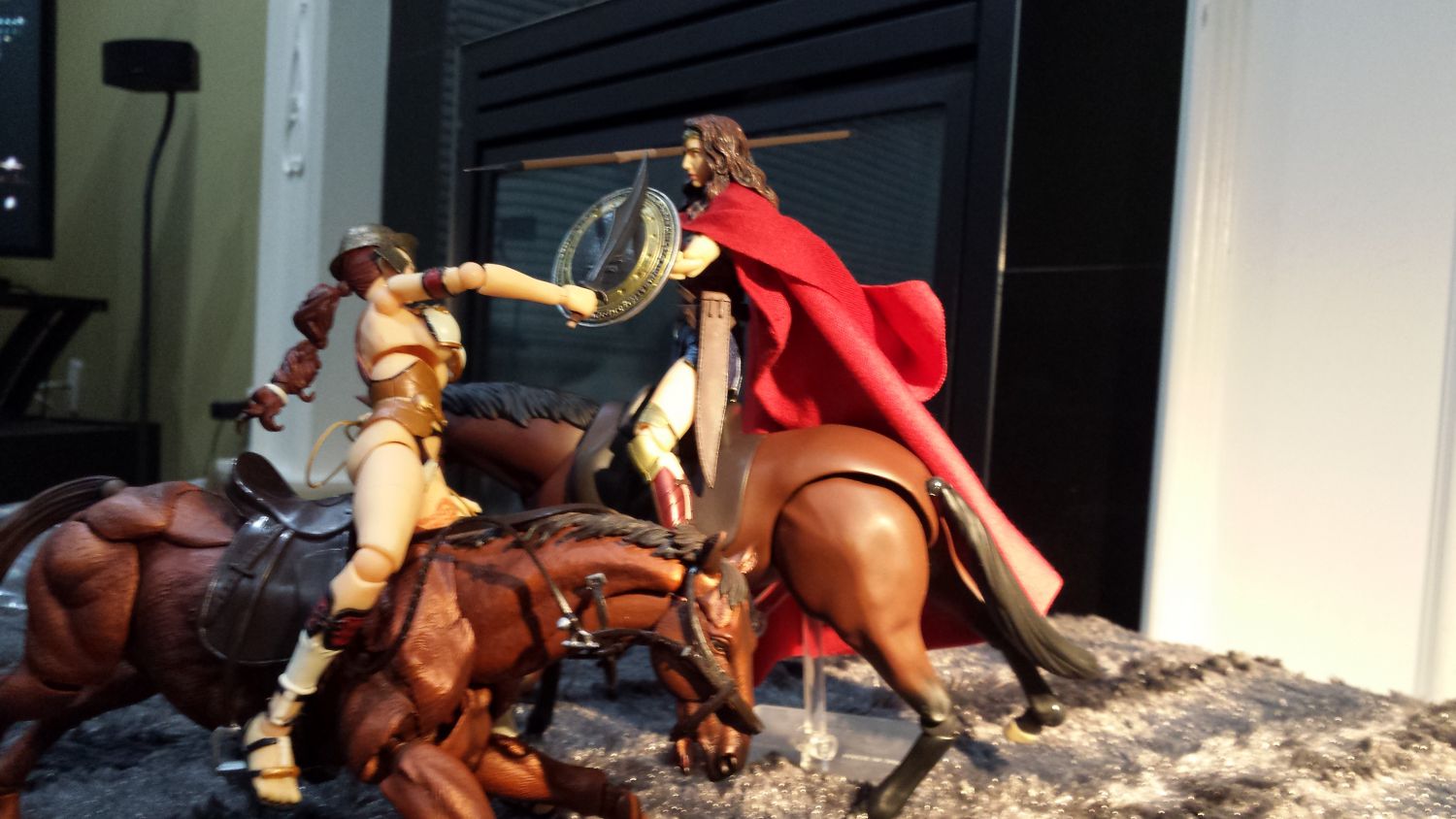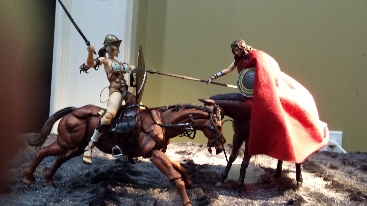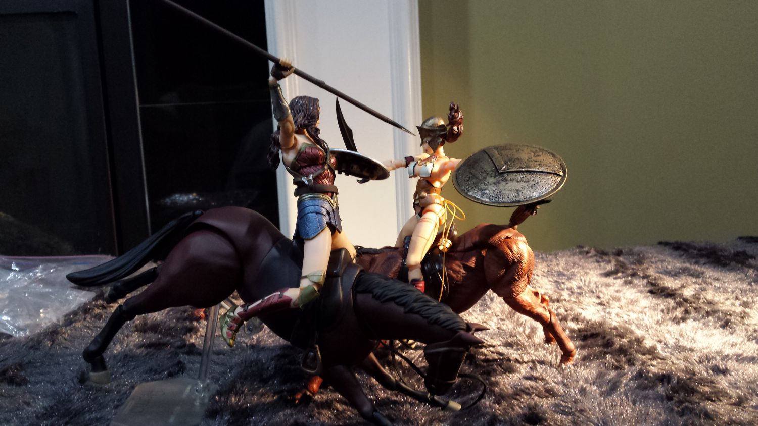 Battle of amazons! Its revoltech queen's blade brawnen..i gave her weapons fron figma leonidas and a kt project horse versus wonder woman on a figma horse.