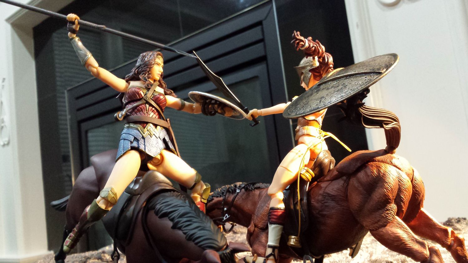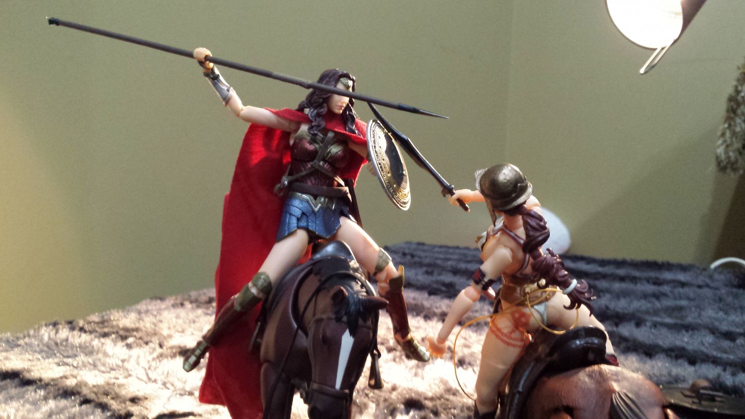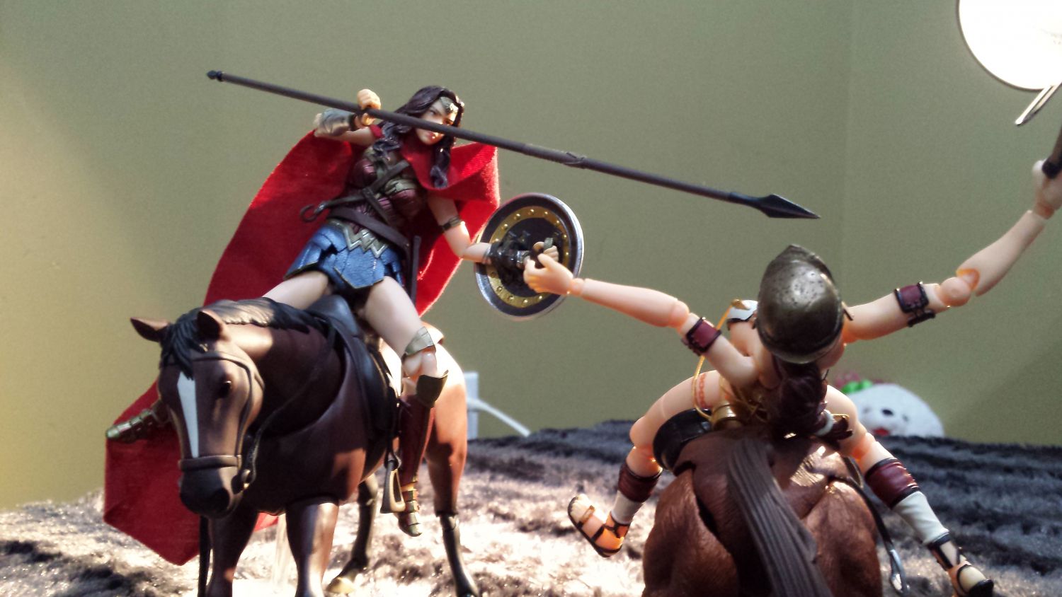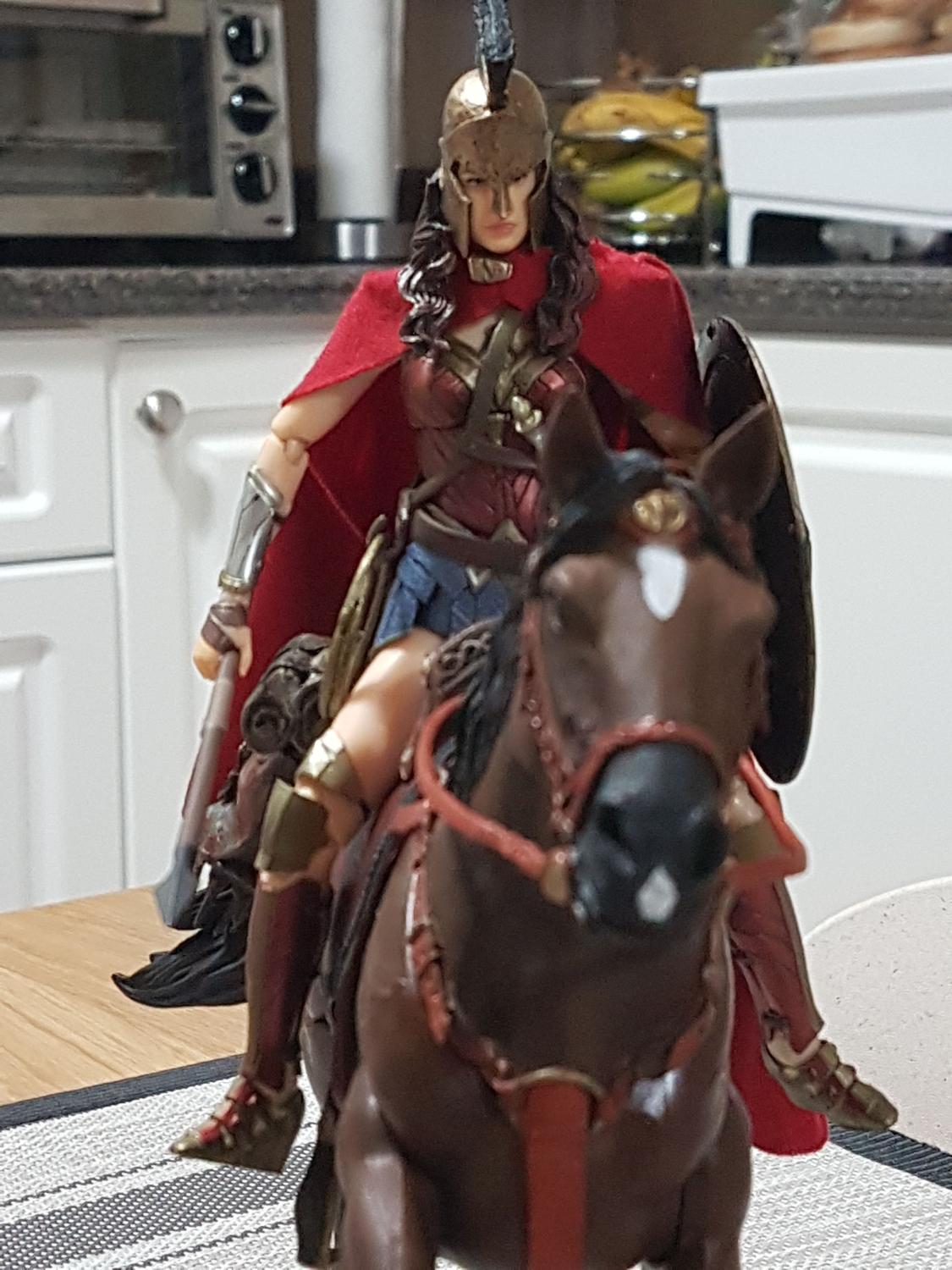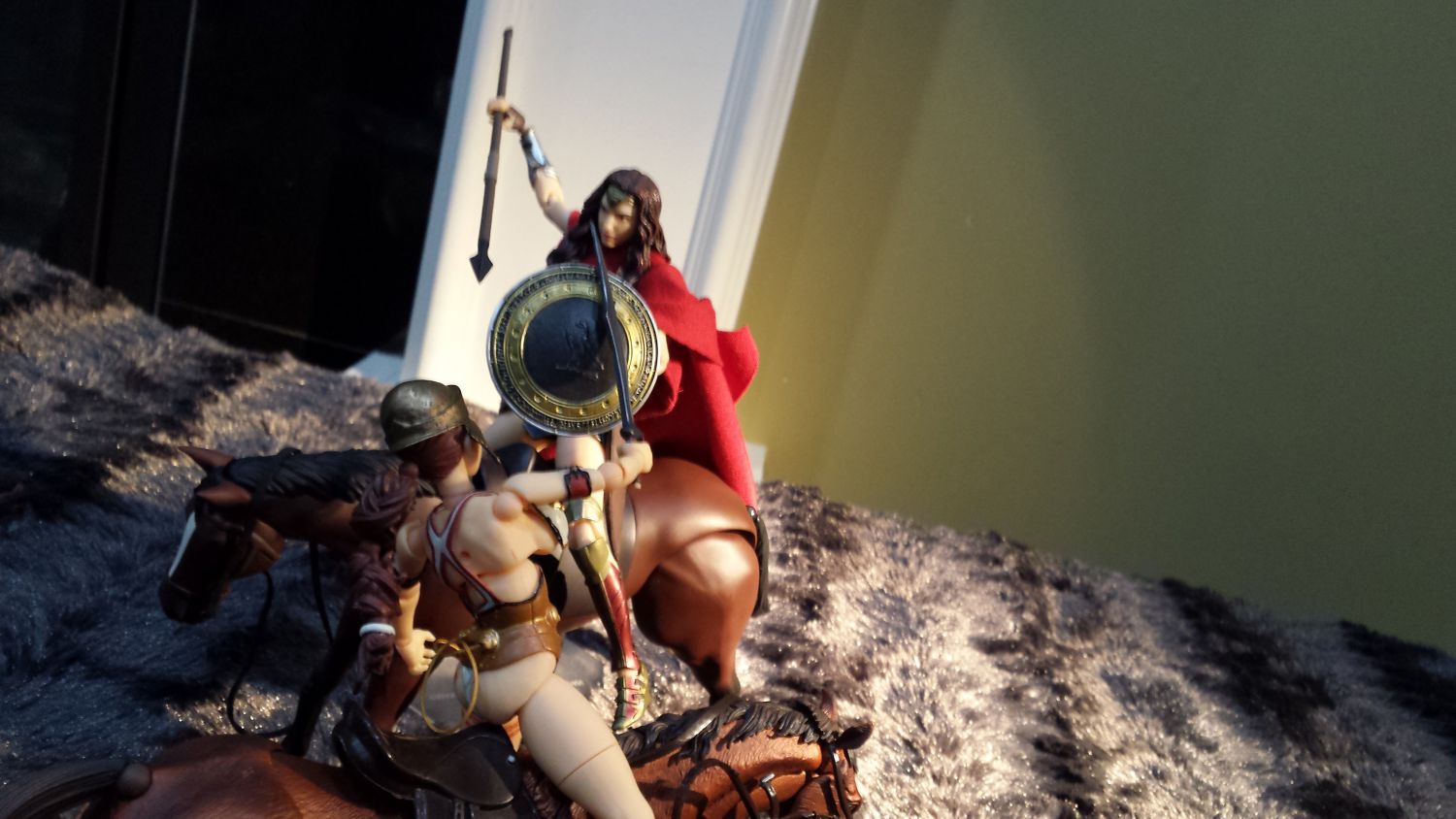 Battle of amazons! Its revoltech queen's blade brawnen..i gave her weapons fron figma leonidas and a kt project horse versus wonder woman on a figma horse.
