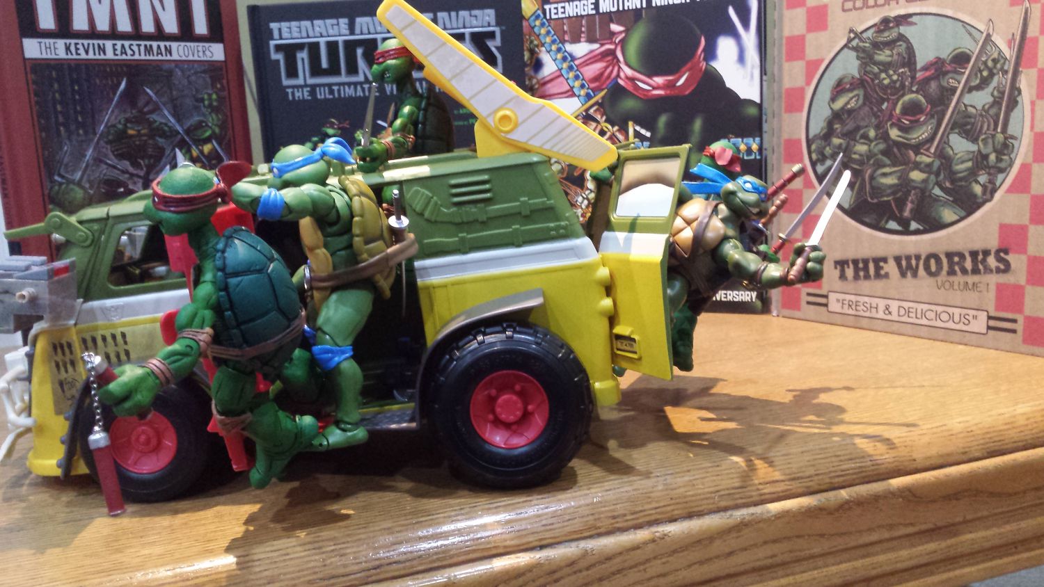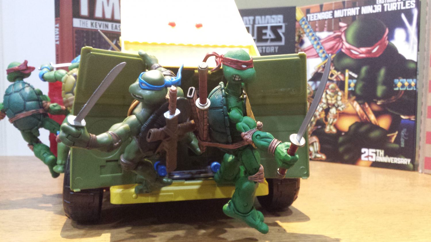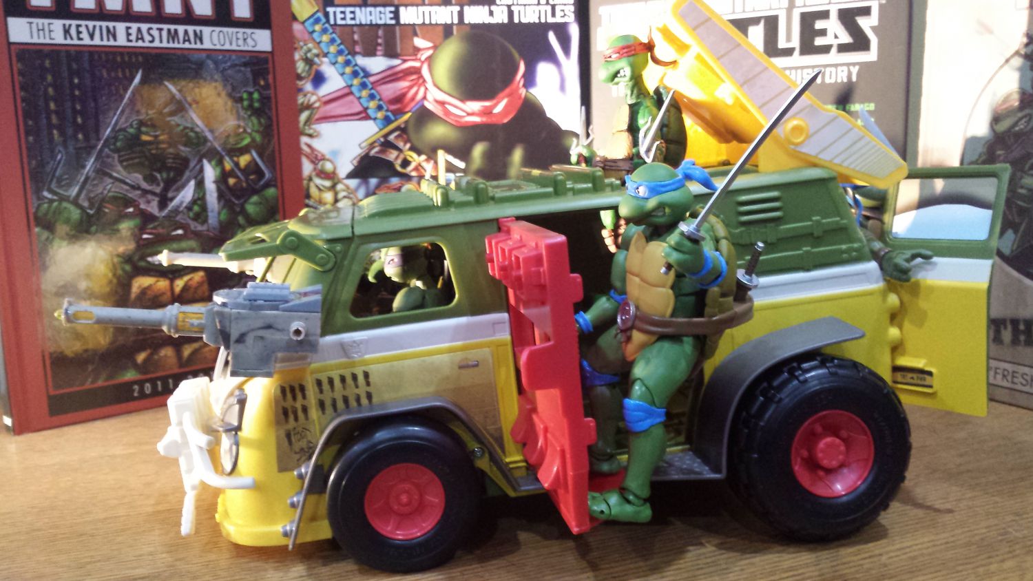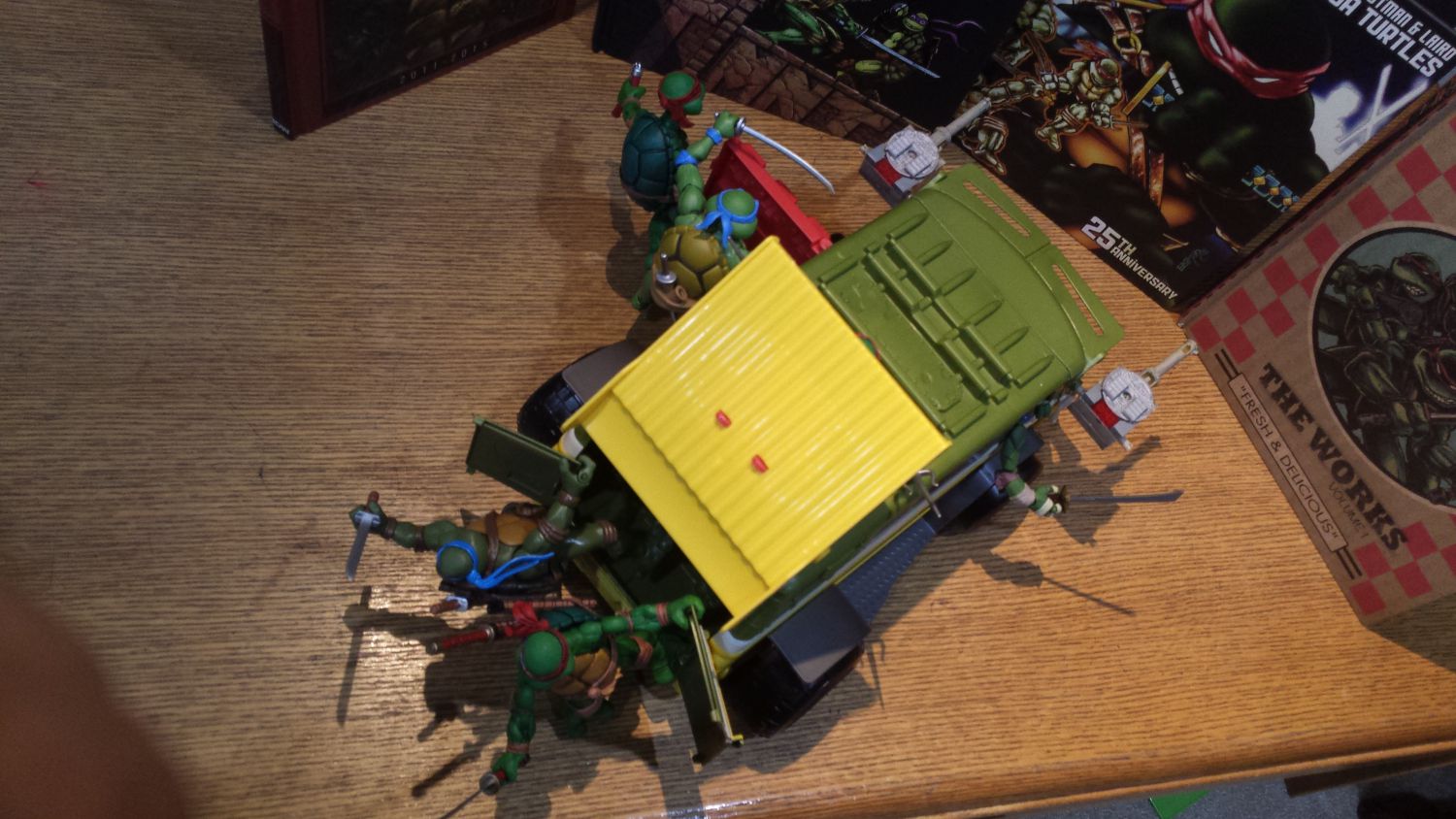 Turtles Forever! Turtles from 4 generations ward off attacks from all side of the party van. Revoltech Donnie is the driver..with revoltech Leo in the front cabin. Sh Figuarts Leo and Neca Mikey fighting off foot soldiers from the side door. Neca Raphael on the rooftop with 2003 Leo and Neca Leo defending the rear side of the van. Notice that two front cannons are formed from Mega Bloks..they are fully functional with light and sound at the press of a button.