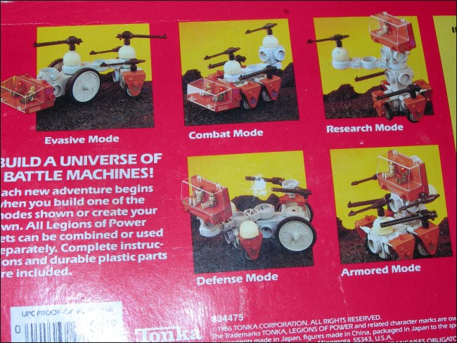 ![]() ![]() ![]() Despite the picture on the package, what you ended up getting was either you ended up getting one of two 4-piece sets, each with a jet, a gun, a cockpit and a trooper. The Star Legions one was a round cockpit with the small articulated gun, the Tech Dynasty one was a square cockpit with the large unarticulated gun. This is the Star Legions Space Capsule in package: ![]() This is the Tech Dynasty Space Capsule in package: ![]() Here, I made the Tech Dynasty Space Capsule from some parts I had in a parts bin: