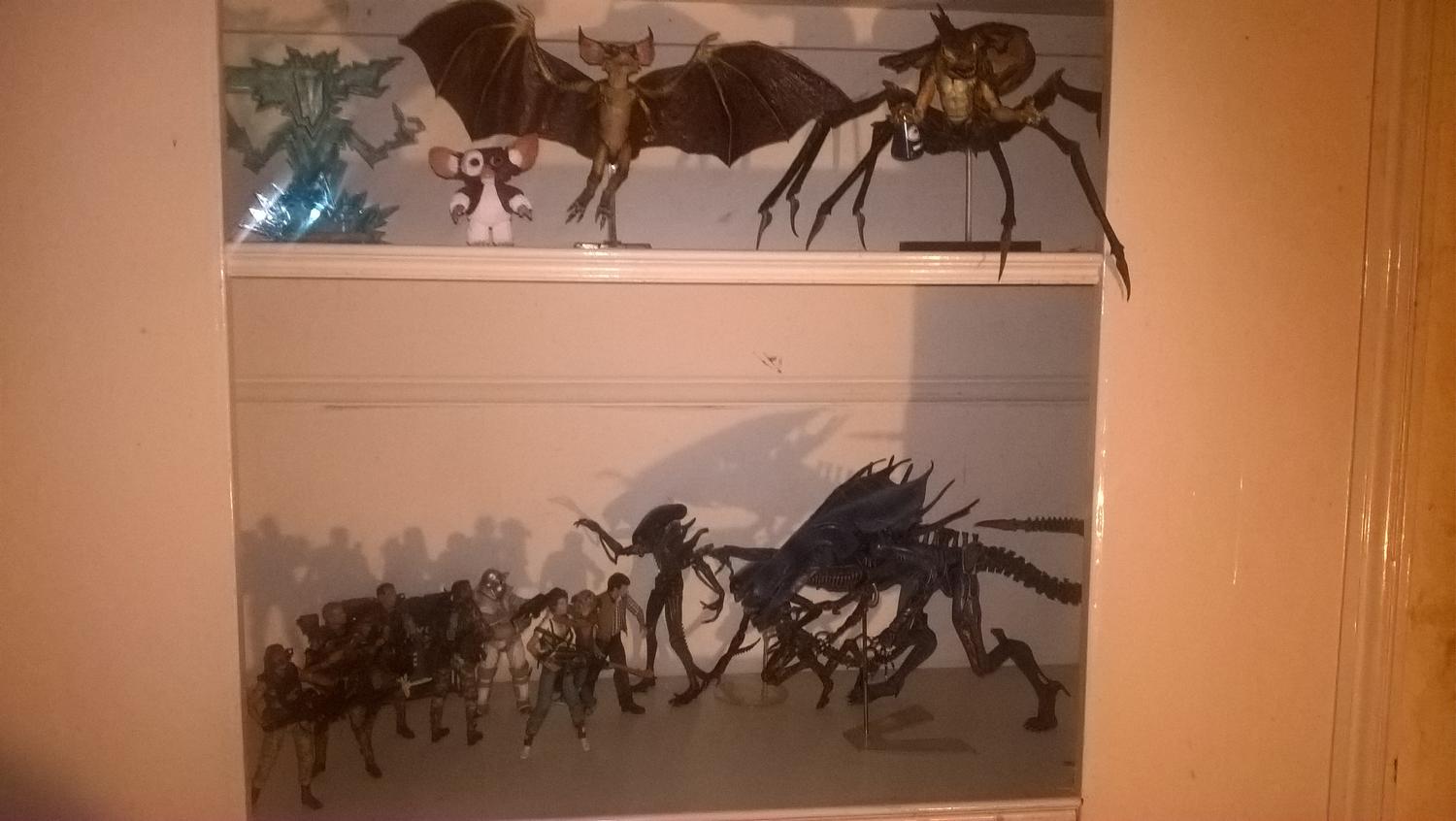 Here’s a different picture with the NECA Aliens on the bottom, and my NECA gremlins on the top. I have a third shelf underneath with a weird mix of the Mezco Debbie, Jason part 6, a couple of NECA predators, and the NECA Ed-209, but it’s kind of mixed in with a lot of my books.