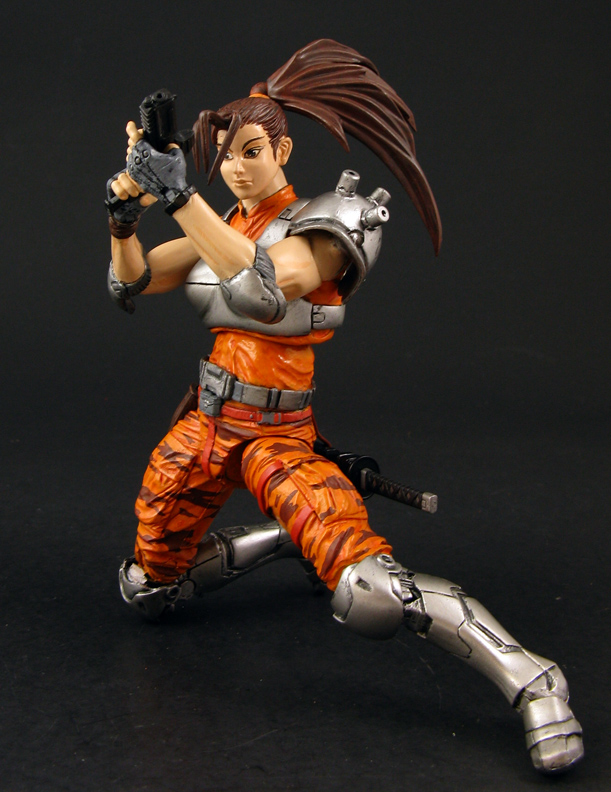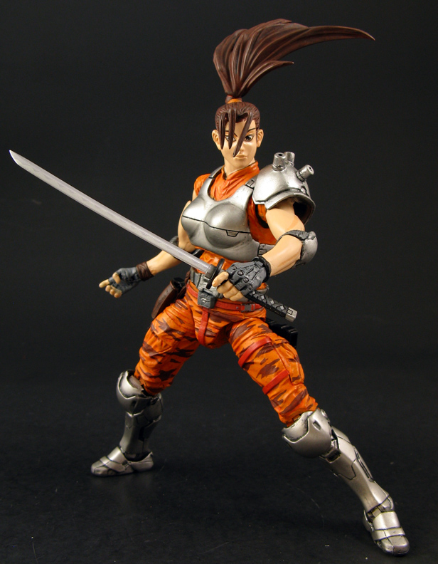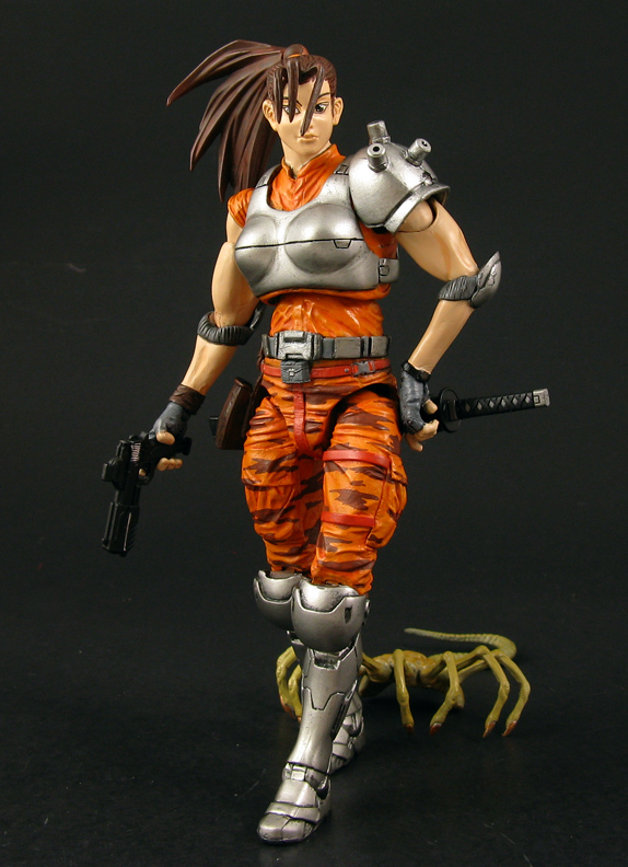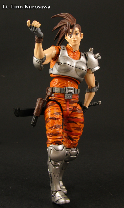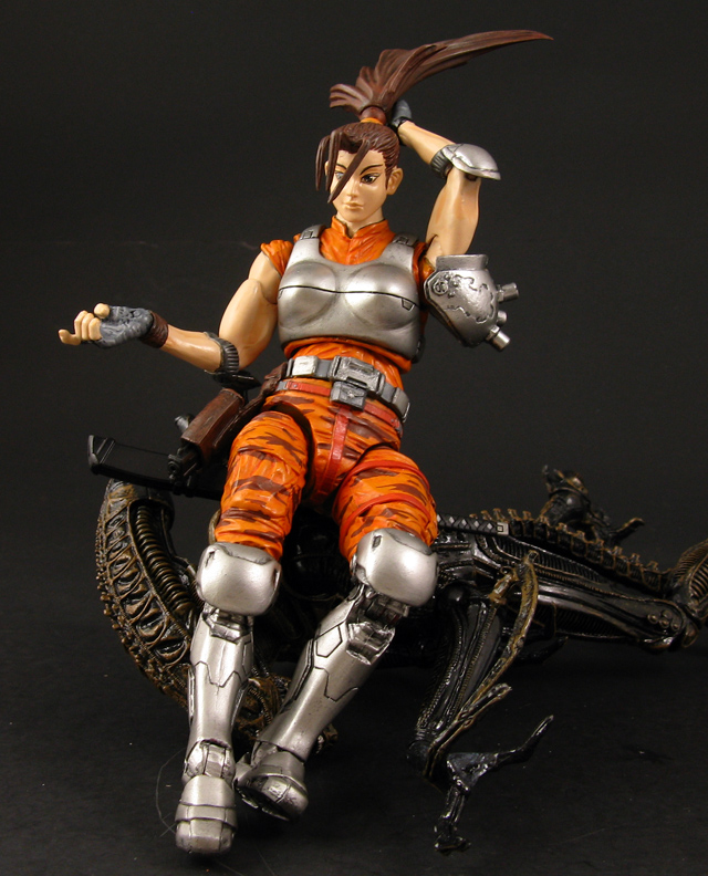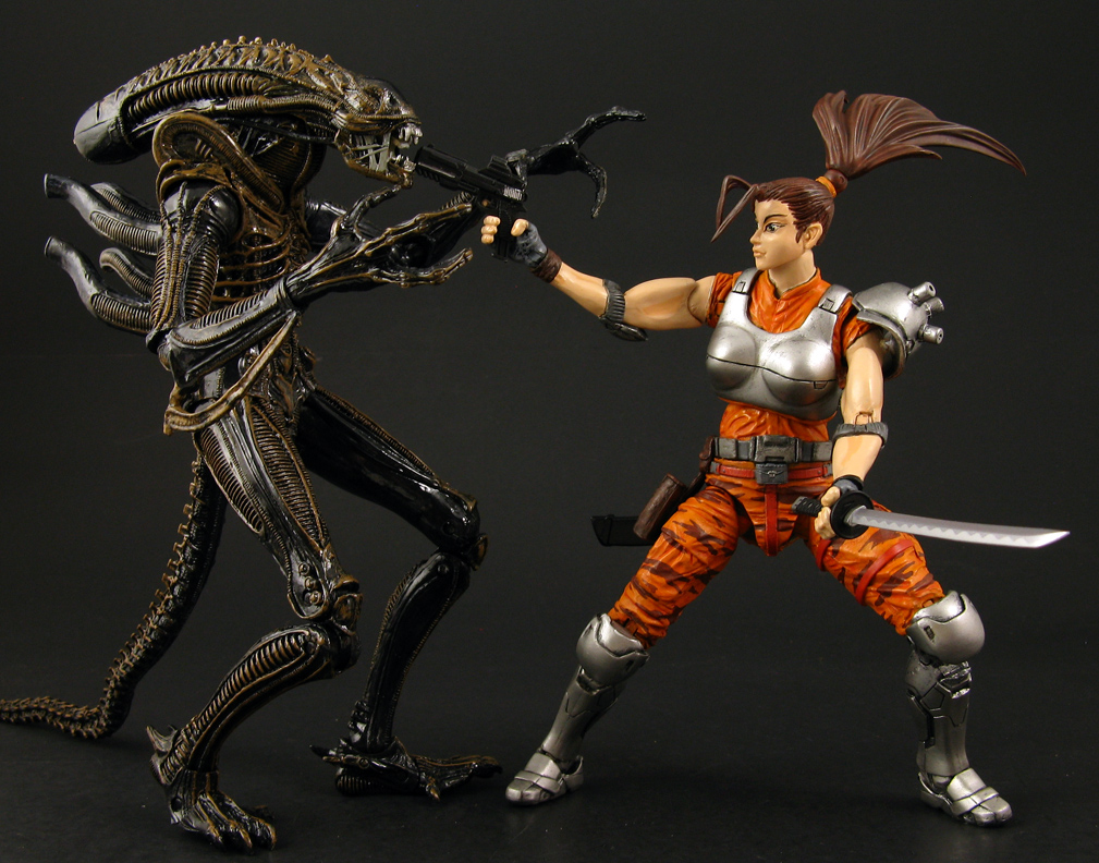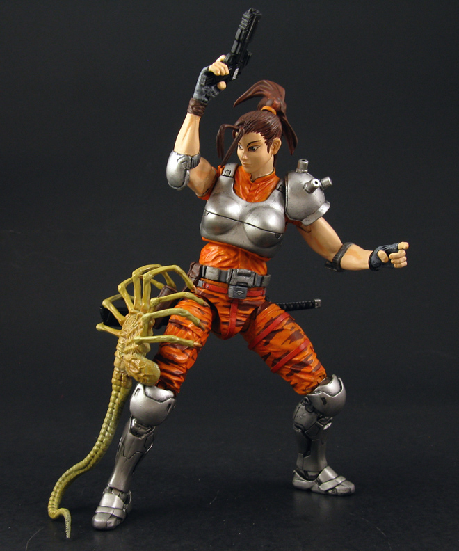Straight from Capcom's Alien vs Predator Arcade game comes this custom Lt. Linn Kurosawa action figure created in 7" NECA Aliens format! She features an articulated pony tail, pistol, and katana, both weapons able to be stored in their holster/sheath. Linn Kurosawa was made from a NECA Dwayne Hicks body, High Dream Chun Li head, revoltech Kenshin hair, hand sculpted breastplate using Aves Studio's Apoxie Sculpt, Mark 42 Iron Man lower legs, Play Arts Cloud Strife shoulder pad, SOTA Ibuki bangs, and ML movie Nick Fury hands. A lot of sanding, carving, and dremelling had to be done to her midsection and various fodder parts were used for her belt and other details. Now Linn can join with Dutch Schaefer and the Hunter Predator customs I've created and fight the Alien infestation!