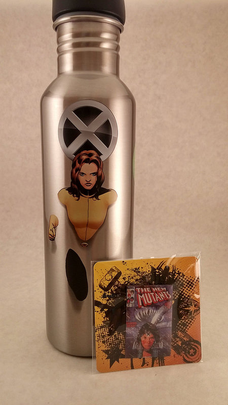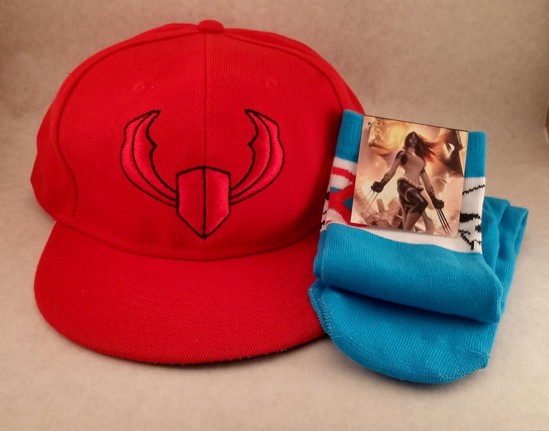 X-men Baseball Tee, Magneto Snapback, Mystique Socks, Kitty Pryde Water Bottle, New Mutants Pin, and a Domino Marvel Legends. |