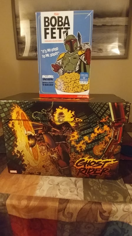 got the ghost rider box from a local comic book shop and the boba fett cereal/shirt from walmart! no cereal involved, but you get the idea!