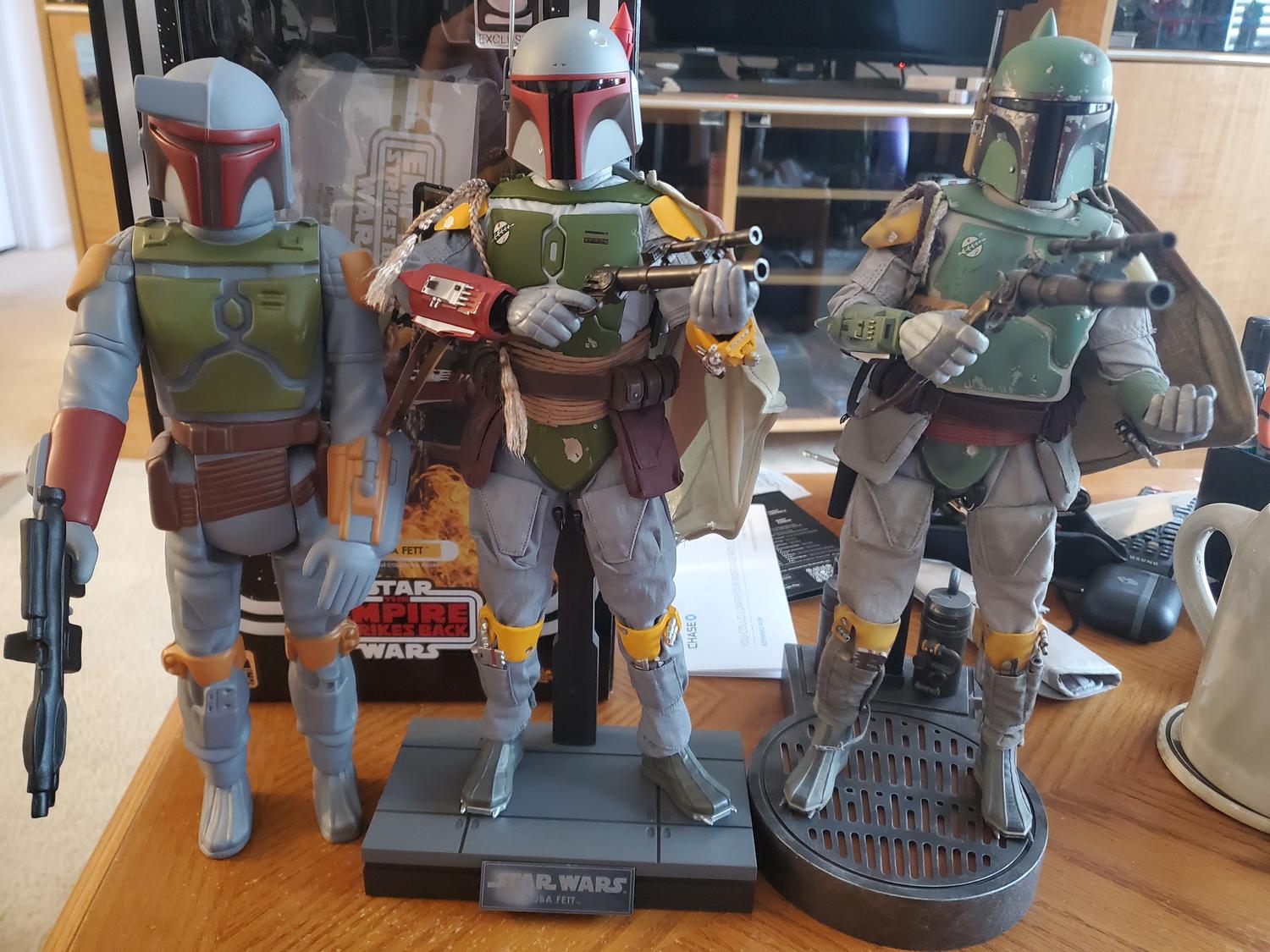 The Sideshow 1/6 scale 40th ESB Boba Fett arrived! I love the color scheme matches the original Boba Fett Figure. The chest piece is now individual pieces which looks amazing on the figure. The weapons on the shin pockets have better sculpts and paint apps than the original on the right. Very happy to add this to the Boba Fett Collection