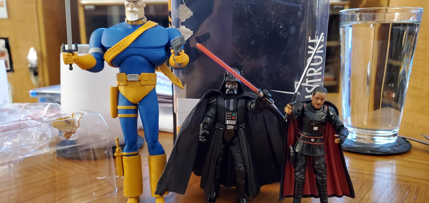 Deathstroke arrived from EE today. I like this figure. The unmasked head sculpt is amazing. He stands well. The uber cuffs on the boots helps. Rogue 1 Vader is a solid Vader. Moff Gideon is the gem! Amazing sculpt on the face. He has a hard time standing with the heavy cape. I have an extra Joe or SW stand that should work.