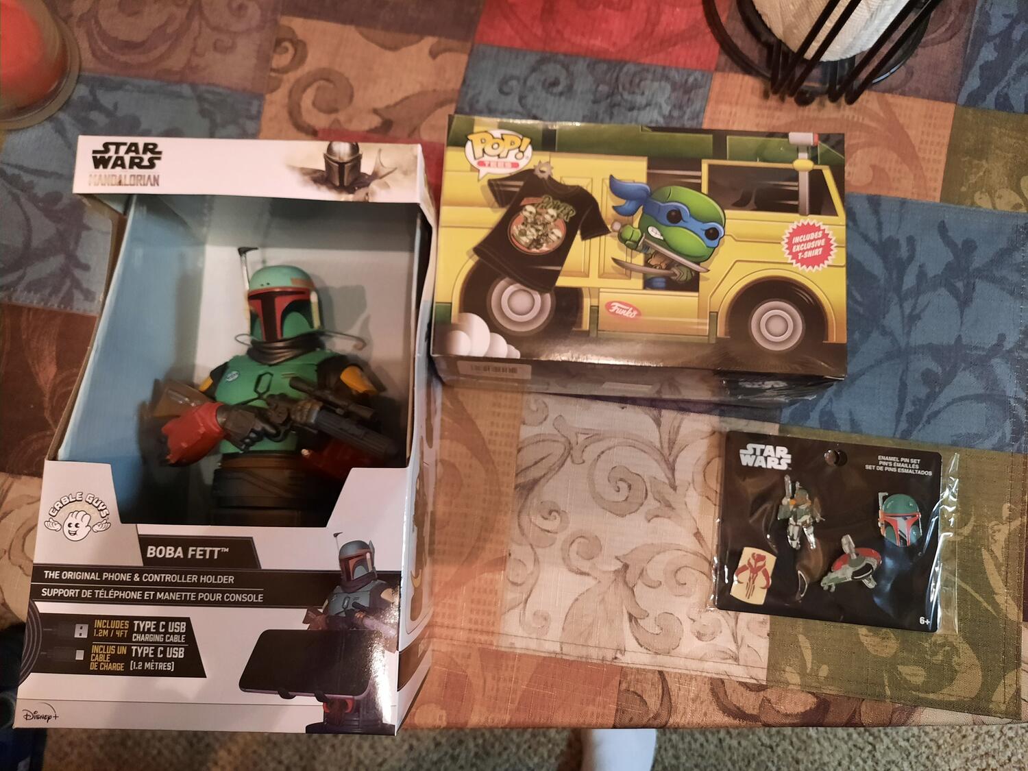 The movies, Voltron dvds, and the Boba Fett phone holder thingy came from a local Best Buy, while the TMNT van t-shirt and Boba Fett hat pins came from a local Target! |