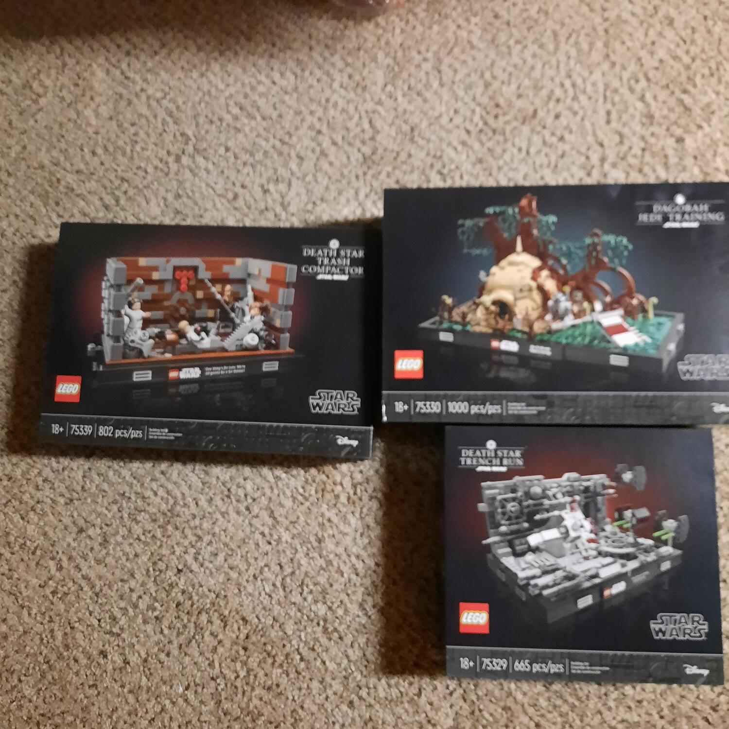 I love them both completed but damn the Dagobah set had a monotonous phase of placing like 200 translucent green tiles to make the swamp water. These are two of my favorite scenes though so having these collector-oriented display pieces is a delight. The Dagobah set is bigger and packs more little details although some purists might not care for the geographic liberty Lego took in planting Luke's X-wing right next to Yoda's hut. The trash compactor is more scene-specific and the closing walls were seriously well thought out in terms of functionality and visuals, plus you get R2 and 3PO hiding out on the backside to complete the hero crew.