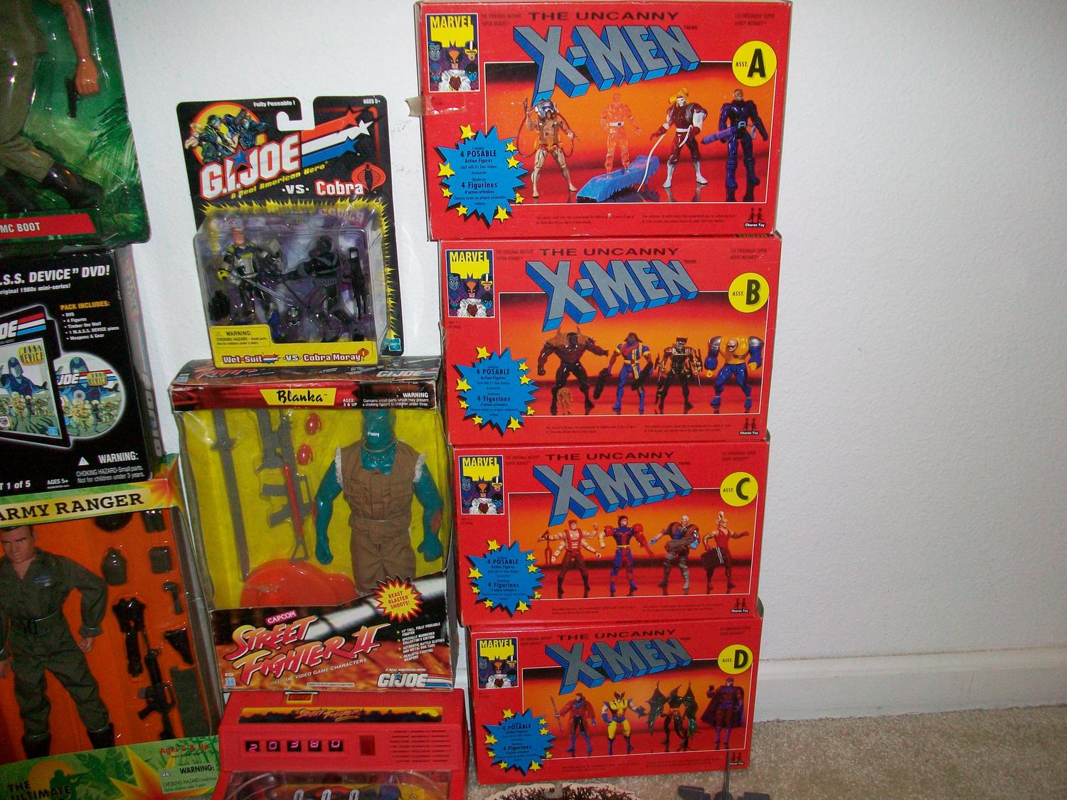 I picked all this up yesterday for $50.00 at a local Antique shop.I got a G1 Transformers Dreadwind in good condition no acc..All 4 X-men Uncanny assortment packs A,B,C & D 3 are sealed and one side of The box the taped dried up and came loose.These are hard to come by.