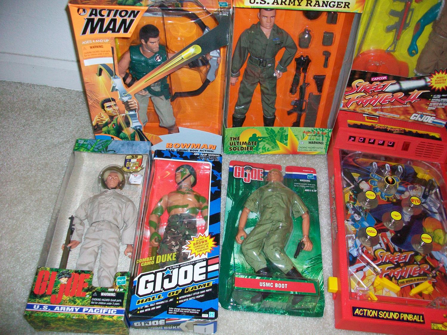 A super Naturals from tonka MOC.Anyone remember these things?lol...Street Fighter II/GI J.O.E - Blanka '12 inch doll MISB..Really don't see them..here is my Fav A Street Fighter pinball machine and it works!!!This is really tough to find. GI J.O.E. Dvd battles #1 M.A.S.S. Device MISB..Also G.I. J.o.e vs Cobra -Wet-suit vs Cobra Moray ***this is with the "ruthless terrorist organization"printed on the back.HTF..Plus 5 ''12 G.I J.o.e dolls Misb/moc.Last a action man ''12 doll misb and a Ulimate soldier army ranger Misb..... Some reason I couldnt post two more pics for I will add them sorry. |