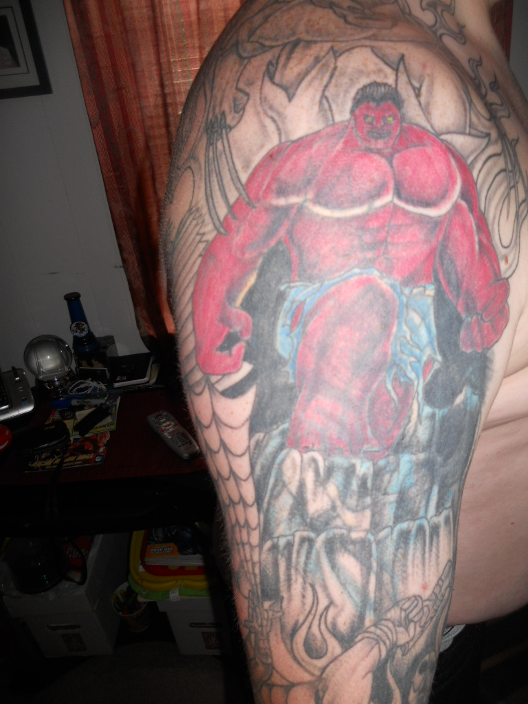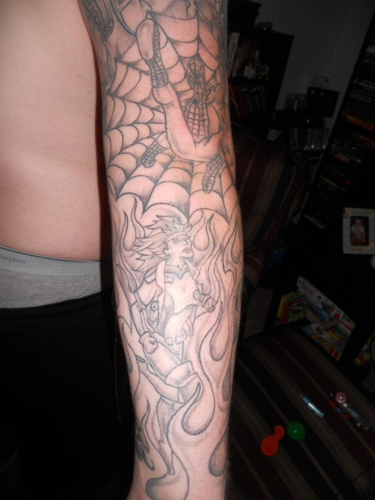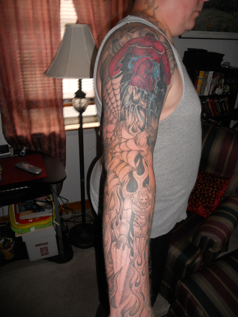 Im putting this here because i just got it, well my last tattoo session finally finished healing. Here is some Marvel appreciation from me and my boy