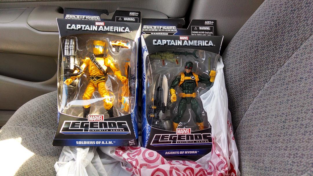 Scored these today in Cerritos and Montclair Targets here in Southern California. I wasn't even going to head to the Target in Cerritos after I finished the work I had to do there, but I just had this feeling and went anyways. Got two sets of each. Lucky me! I was pretty persistent. I asked one of the reps there pretty please with sugar on top to look in the back for the green hydra dude (since he wasn't on the peg in the Montclair target) and he found it. Just plain awesome. So my haul today two Aim and two hydra dudes. Checked a few more Targets as well in Chino and Chino Hills but those either had only Caps, Zemos or Skulls. One did have (the Chino one) a Spiderman, but the rest were empty pegs. Ironically the lone Spiderman I did find was priced 19.99 while the others were still 14.99...hmm guess they figured it out!