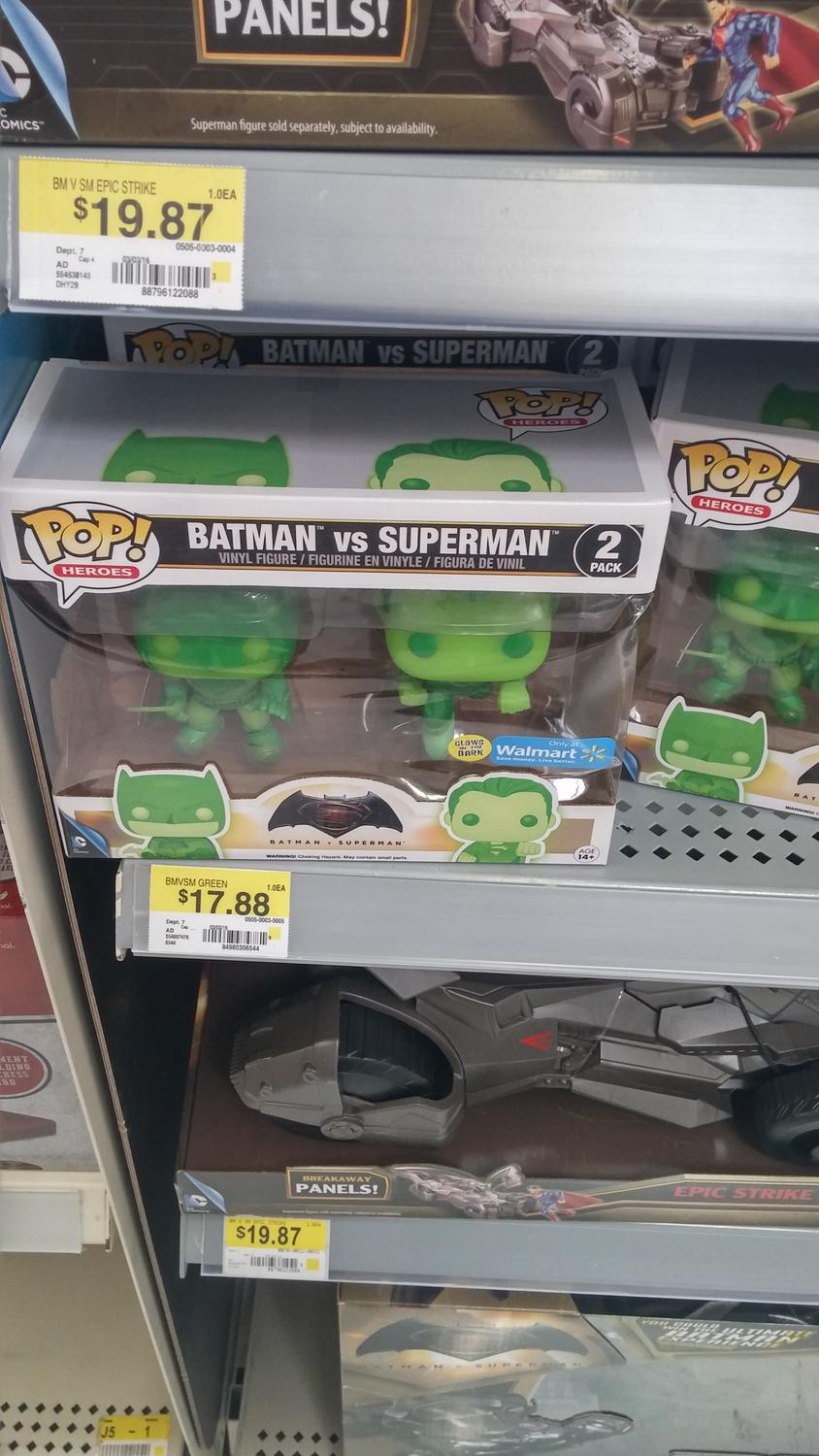 I saw like 20 of those green pops at one of my local Marts stacked in the middle of the Lego section. I have to guess it was because they were exact opposite of where the BvS stuff was in the figure aisle.