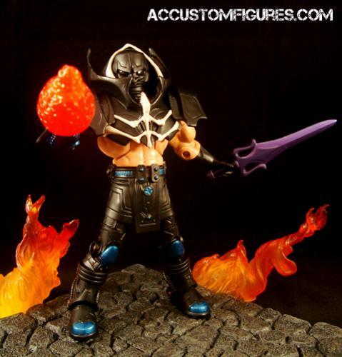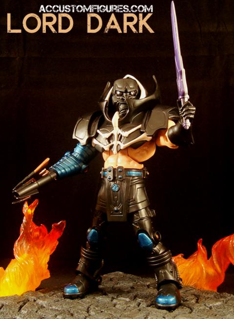 At last, making his long awaited debut, Lord Dark, the ruthless tyrant ruler of Dark Eternia. It is said that when Queen Marlena crashed on Eternia, there was a human stowaway on her ship. This human fell through the fracture caused by the crash and became trapped in Dark Eternia. Once there he quickly rose to power. Now that his forces have invaded Eternia, he has taken half of He-Man’s power and half of Skeletor’s power and constructed a sword. The Dark Sword of Power! And he shall use it to crush Eternia! Lord Dark also comes with a removable blast effect that fits into his arm cannon! Lord Dark was made from a MOTUC upper, Zodak arm, Srong-Or arm, Lex Luthor lower, Extendar head with some Kabuki mask, Faceless One armor and fodder for his cannon. The paint job looks simple at first but is filled with different black highlights, and bone and metallic highlights. Enjoy! AC |
