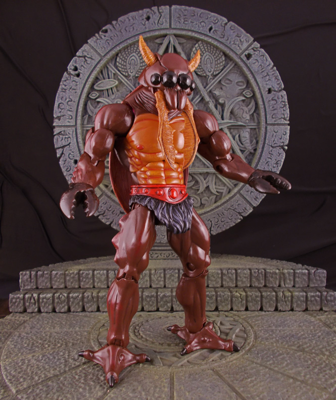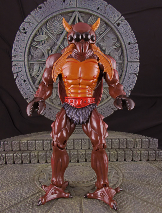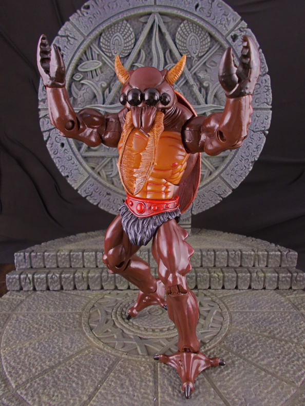 Mandible Man is based on a concept art sketch from the Power and Honor Foundation Catalog #1, appearing as some sort of beetle character. Here he was created in Classics form using a Tung-Lashor body, Buzz-off lower arms/upper legs, TMNT Cockroach Terminator modded back shell, and a custom sculpted head. The base of the head is actually Tung-Lashor's with the horns coming out of his eye sockets. Posable mandibles came from a McFarlane flood Stalker. He was given a glossy coat for his beetle shell and features dark red highlights to it. |